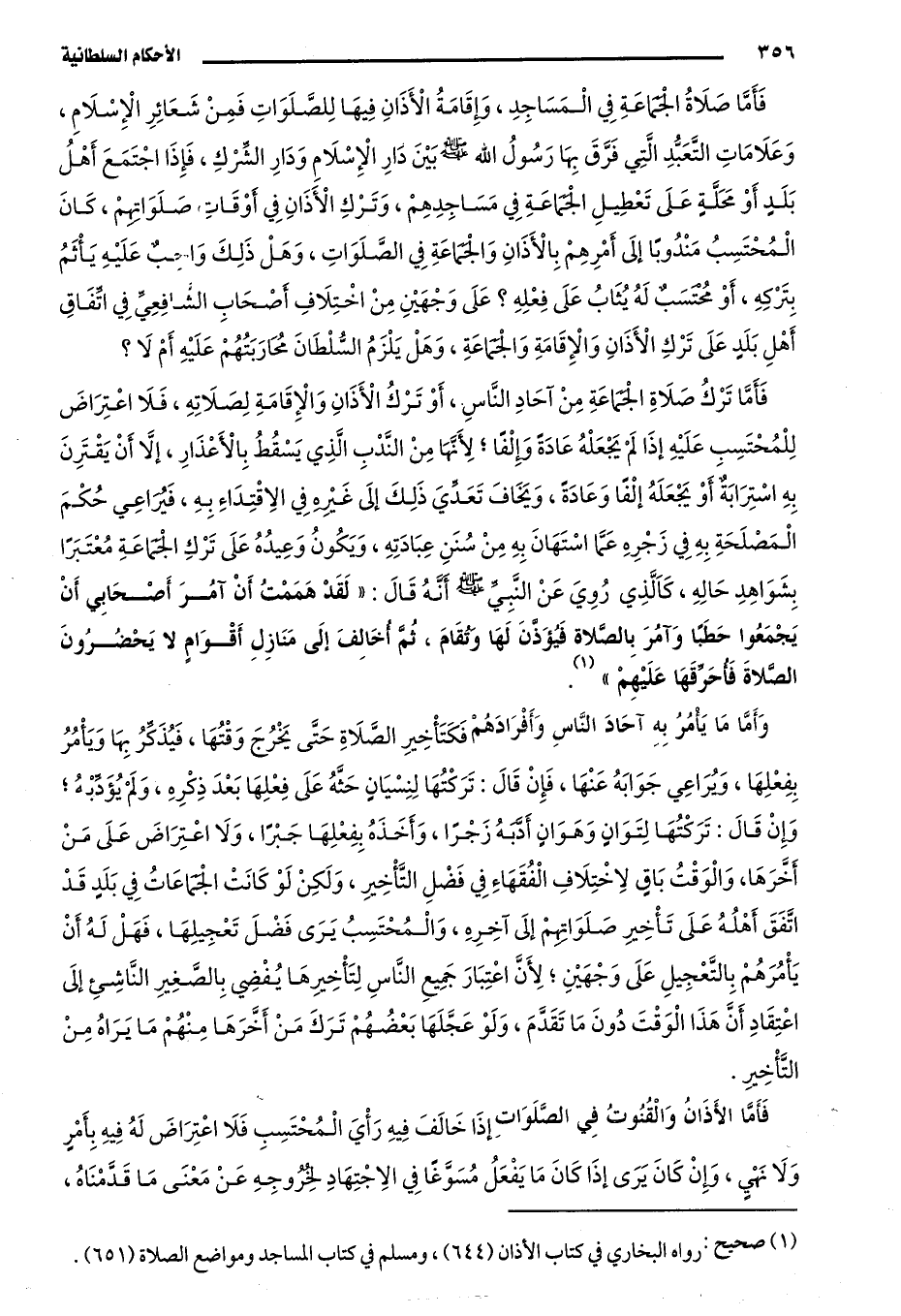 فأمَّا صلاة الجماعة في المساجد، وإقامة الأذان فيها للصلوات فمن شعائر الإسلام، وعلامات التعبُّد التى فرَّق بها رسول الله -صلى الله عليه وسلم- بين دار الإسلام ودار الشرك، فإذا اجتمع أهل بلد أو محلة على تعطيل الجماعة في مساجدهم، وترك الأذان في أوقات صلواتهم، كان المحتسب مندوبًا إلى أمرهم بالأذان والجماعة في الصلوات، وهل ذلك واجب عليه يأثم بتركه، أو محتسب له يثاب على فعله؟ على وجهين من اختلاف أصحاب الشافعي في اتفاق أهل بلد على ترك الأذان والإقامة والجماعة، وهل يلزم السلطان محاربتهم عليه أم لا؟