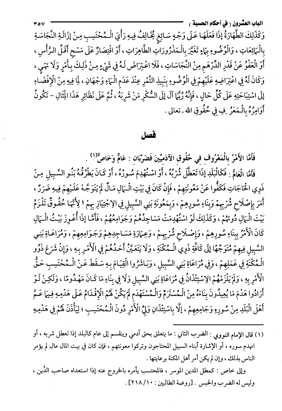 فأما العام: فكالبلد إذا تعطل شربه، أو استهدم سوره، أو كان يطرقه بنو السبيل من ذوي الحاجات فكفّوا عن معونتهم، فإن كان في بيت المال مال لم يتوجه عليهم فيه ضرر، أمر بإصلاح شربهم وبناء سورهم، وبمعونة بني السبيل في الاجتياز بهم؛ لأنها حقوق تلزم بين المال دونهم، وكذلك لو استهدمت مساجدهم وجوامعهم، فأما إذا أعوز بيت المال كان الأمر ببناء سورهم وإصلاح شربهم وعمارة مساجدهم وجوامعيهم، ومراعاة ببني السبيل فيهم متوجهًا إلى كافة ذوي المكنة، ولا يتعين أحدهم في الأمر به، وإن شرع ذوو المكنة في عملهم، وفي مراعاة بني السبيل، وباشروا القيام به سقط عن المحتسب حق الأمر به، ولم يلزمهم الاستئذان في مراعاة بني السبيل ولا في بناء ما كان مهدومًا، ولكن لو أرادوا هدم ما يعيدون بناءه من المسترمّ والمستهدم لم يكن لهم الإقدام على هدمه فيما عم أهل البلد من سوره وجامعهم إلا باستئذان ولي الأمر دون المحتسب؛ ليأذن لهم في هدمه