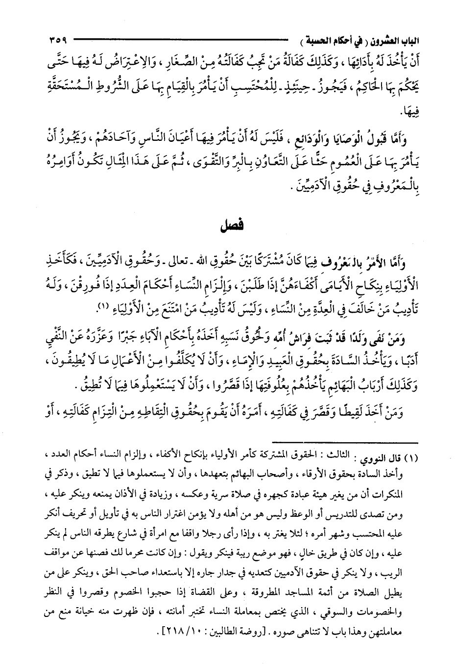 1 قال النووي: الثالث: الحقوق المشتركة كأمر الأولياء بإنكاح الأكفاء وإلزام النساء أحكام العدد، وأخذ السادة بحقوق الأرقاء، وأصحاب البهائم بتعهدها، وأن لا يستعملوها فيما لا تطيق، وذكر في المنكرات أن من يغير هيئة عبادة كجهره في صلاة سرية وعكسه، وزيادة في الأذان يمنعه وينكر عليه، ومن تصدى للتدريس أو الوعظ وليس هو من أهله، ولا يؤمن اغترار الناس به في تأويل أو تحريف أنكر عليه المحتسب وشهر أمره؛ لئلَّا يغتر به، وإذا رأى رجلًا واقفا مع امرأة في شارع يطرقه الناس لم ينكر عليه، وإن كان في طريق خال، فهو موضع ريبة فينكر ويقول: وإن كانت محرمًا لك فصنها عن مواقف الريب، ولا ينكر في حقوق الآدميين كتعديه في جدار جاره باستعداء صاحب الحق وينكر على من يطيل الصلاة من أئمة المساجد المطروقة، وعلى القضاة إذا حجبوا الخصوم وقصروا في النظر والخصومات والسوقي، الذي يختص بمعاملة النساء تختبر أمانته، فإن ظهرت منه خيانة منع من معاملتهن وهذا باب لا تتناهي صورة. [روضة الطالبين: 10/ 218] .