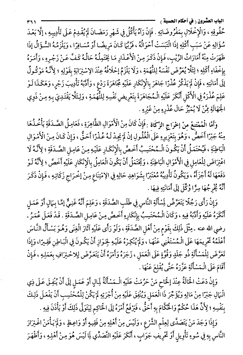 وإن رأى رجلًا يتعرّض لمسألة الناس في طلب الصدقة، وعلم أنه غني إما بمال أو عمل أنكره عليه وأدّبه فيه، وكان المحتسب بإنكاره أخص من عامل الصدقة. قد فعل عمر -رضي الله عنه- مثل ذلك بقوم من أهل الصدقة، ولو رأى عليه آثار الغنى وهو يسأل الناس أعلمه تحريمها على المستغني عنها، ولم ينكره عليه لجواز أن يكون في الباطن فقيرًا، وإذا تعرّض للمسألة ذو جلد وقوة على العمل، زجره وأمره أن يتعرض للاحتراف بعمله، فإن أقام على المسألة عزره حتى يقلع عنها.