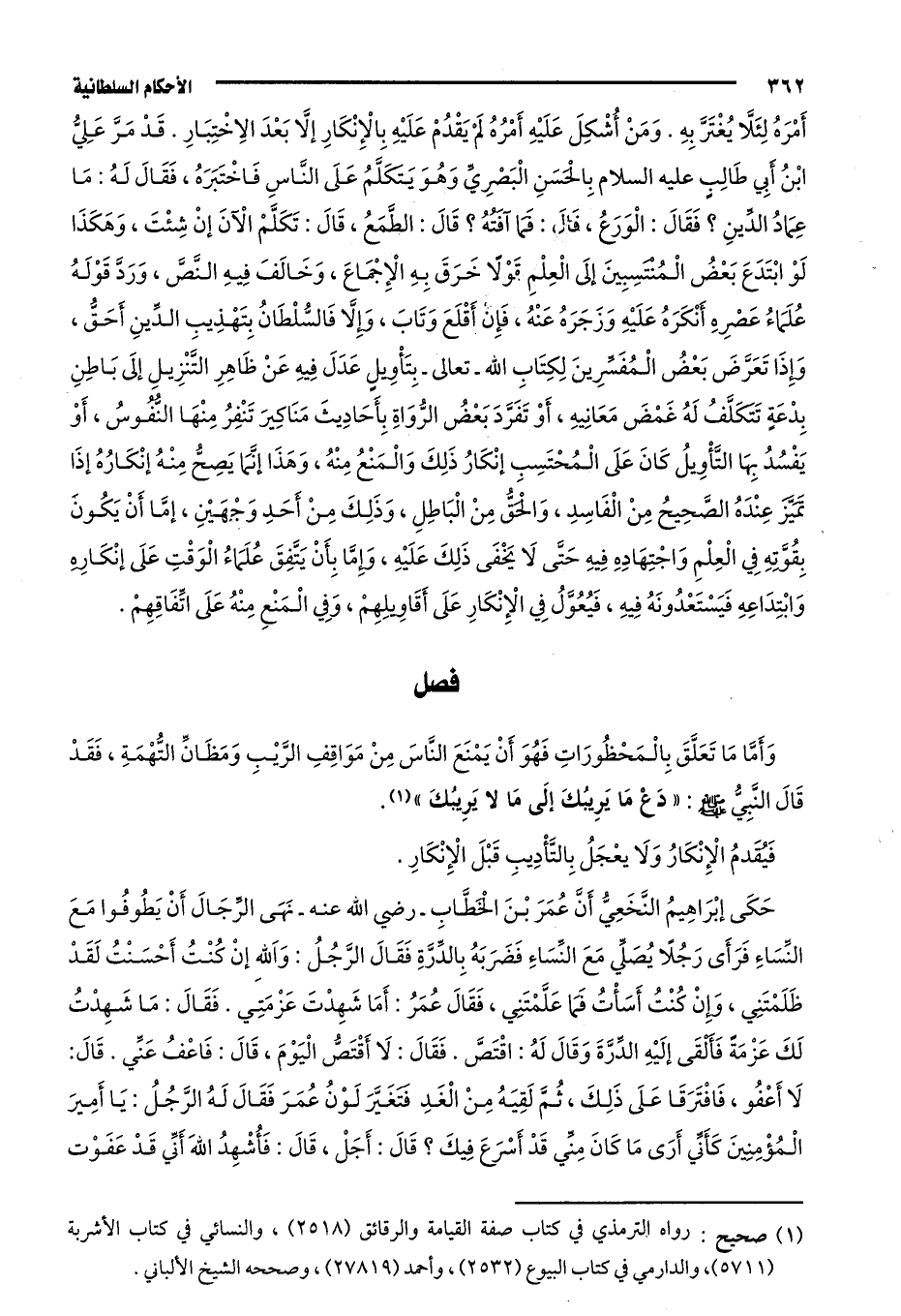 أمره لئلَّا يغتر به. ومن أشكل عليه أمره لم يقدم عليه بالإنكار عليه إلّا بعد الاختبار. قد مرَّ علي ابن أبي طالب -عليه السلام- بالحسن البصري وهو يتكلم على الناس فاختبره، فقال له: ما عماد الدين؟ فقال: الورع، قال: فما آفته؟ قال: الطمع، قال: تكلّم الآن إن شئت، وهكذا لو ابتدع بعض المنتسبين إلى العلم قولًا خرق به الإجماع، وخالف فيه النص، وردّ قوله علماء عصره، أنكره عليه وزجره عنه، فإن أقلع وتاب وإلا فالسلطان بتهذيب الدين أحق، وإذا تعرض بعض المفسرين لكتاب الله تعالى بتأويل عدل فيه عن ظاهر التنزيل إلى باطن بدعة تتكلف له غمض معانيه، أو تفرَّد بعض الرواة بأحاديث مناكير تنفر منها النفوس، أو يفسد بها التأويل كان على المحتسب إنكار ذلك والمنع منه، وهذا إنما يصح منه إنكاره إذا تميز عنده الصحيح من الفاسد، والحق من الباطل، وذلك من أحد وجهين، إما أن يكون بقوته في العلم واجتهاده فيه حتى لا يخفى ذلك عليه، وإما بأن يتفق علماء الوقت على إنكاره وابتداعه فيستعدونه، فيعول في الإنكار على أقاويلهم، وفي المنع منه على اتفاقهم.
