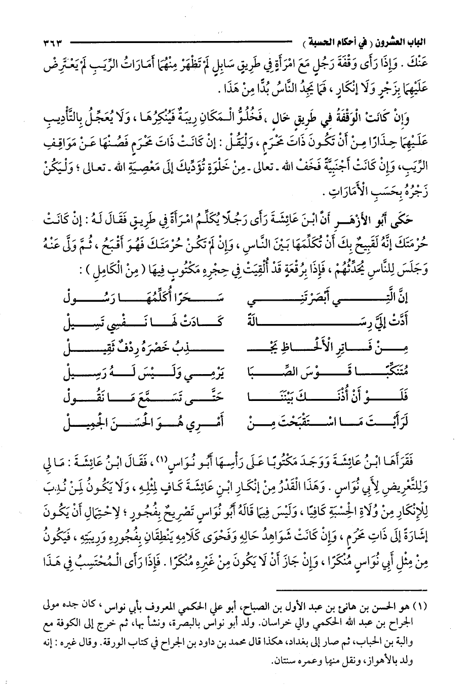 فقرأها ابن عائشة ووجد مكتوبًا على رأسها أبو نواس1، فقال ابن عائشة: ما لي وللتعويض لأبي نواس، وهذا القدر من إنكار ابن عائشة كافٍ لمثله، ولا يكون لمن ندب للإنكار من ولاه الحسبة كافيًا، وليس فيما قال أبو نواس تصريح بفجور؛ لاحتمال أن يكون إشارة إلى ذات محرم، وإن كانت شواهد حاله وفحوى كلامه ينطقان بفجوره وريبته، فيكون من مثل أبي نواس منكرًا، وإن جاز أن يكون من غيره منكرًا. فإذا رأى المحتسب في هذا