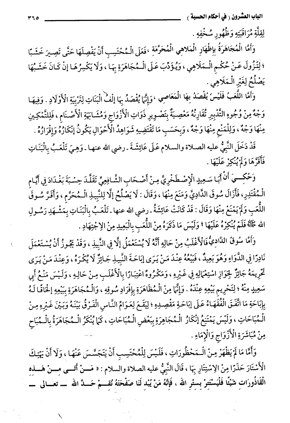 وحكي أن أبا سعيد الإصطخري من أصحاب الشافعي تقلّد حسبة بغداد في أيام المقتدر، فأزال سوق الدادي ومنع منها، وقال: لا يصلح إلّا النبيذ المحرم، وأقر سوق اللعب ولم يمنع منها، وقال: قد كانت عائشة -رضي الله عنها- تلعب بالبنات بمشهد رسول الله -صلى الله عليه وسلم- فلم ينكره عليها؛ وليس ما ذكره من اللعب بالبعيد من الاجتهاد.
