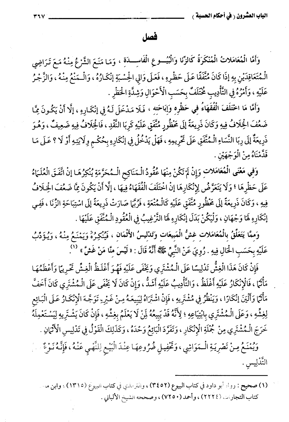 ومما يتعلق بالمعلاملات غش المبيعات وتدليس الأثمان، فينكره ويمنع منه، ويؤدب عليه بحسب الحال فيه، روي عن النبي -صلى الله عليه وسلم- أنه قال: "ليس منا من غش" 1.