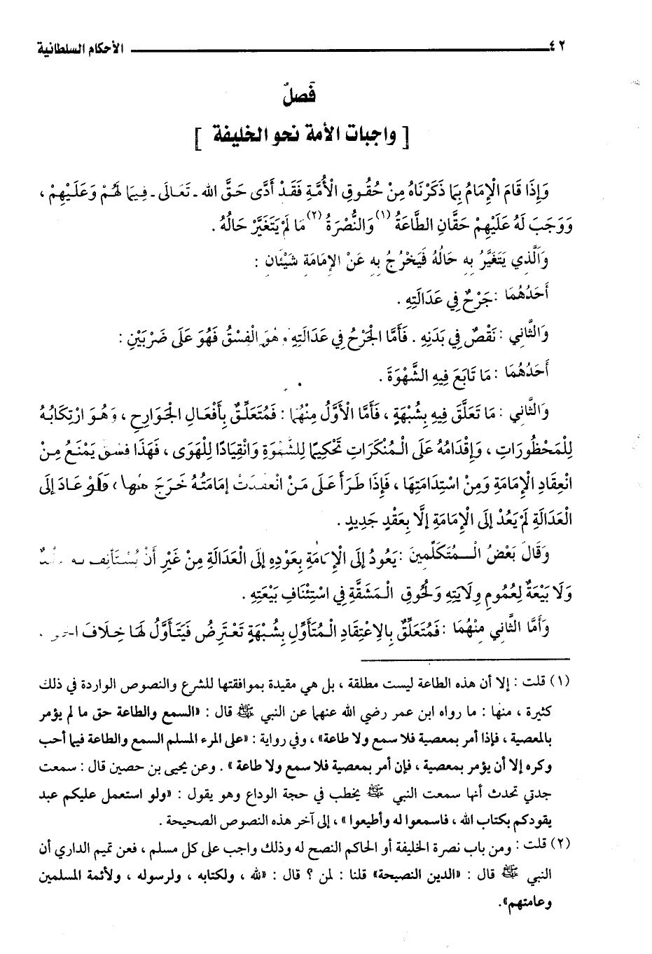 وَإِذَا قَامَ الْإِمَامُ بِمَا ذَكَرْنَاهُ مِنْ حُقُوقِ الْأُمَّةِ، فَقَدْ أَدَّى حَقَّ اللَّهِ تَعَالَى فِيمَا لَهُمْ وَعَلَيْهِمْ، وَوَجَبَ لَهُ عَلَيْهِمْ حَقَّانِ: الطَّاعَةُ1 وَالنُّصْرَةُ2 مَا لَمْ يَتَغَيَّرْ حَالُهُ.