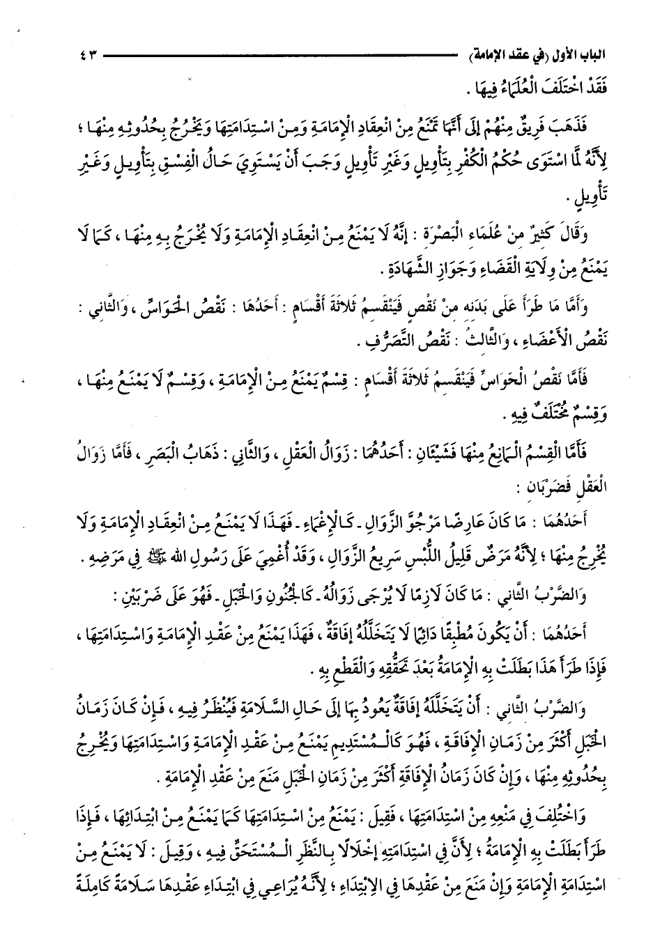 أَحَدُهُمَا: مَا كَانَ عَارِضًا مَرْجُوَّ الزَّوَالِ كَالْإِغْمَاءِ، فَهَذَا لَا يَمْنَعُ مِنَ انْعِقَادِ الْإِمَامَةِ، وَلَا يُخْرِجُ مِنْهَا؛ لِأَنَّهُ مَرَضٌ قَلِيلُ اللّبْسِ، سَرِيعُ الزَّوَالِ، وَقَدْ أُغْمِيَ عَلَى رَسُولِ اللَّهِ -صَلَّى اللَّهُ عَلَيْهِ وَسَلَّمَ- فِي مَرَضِهِ.