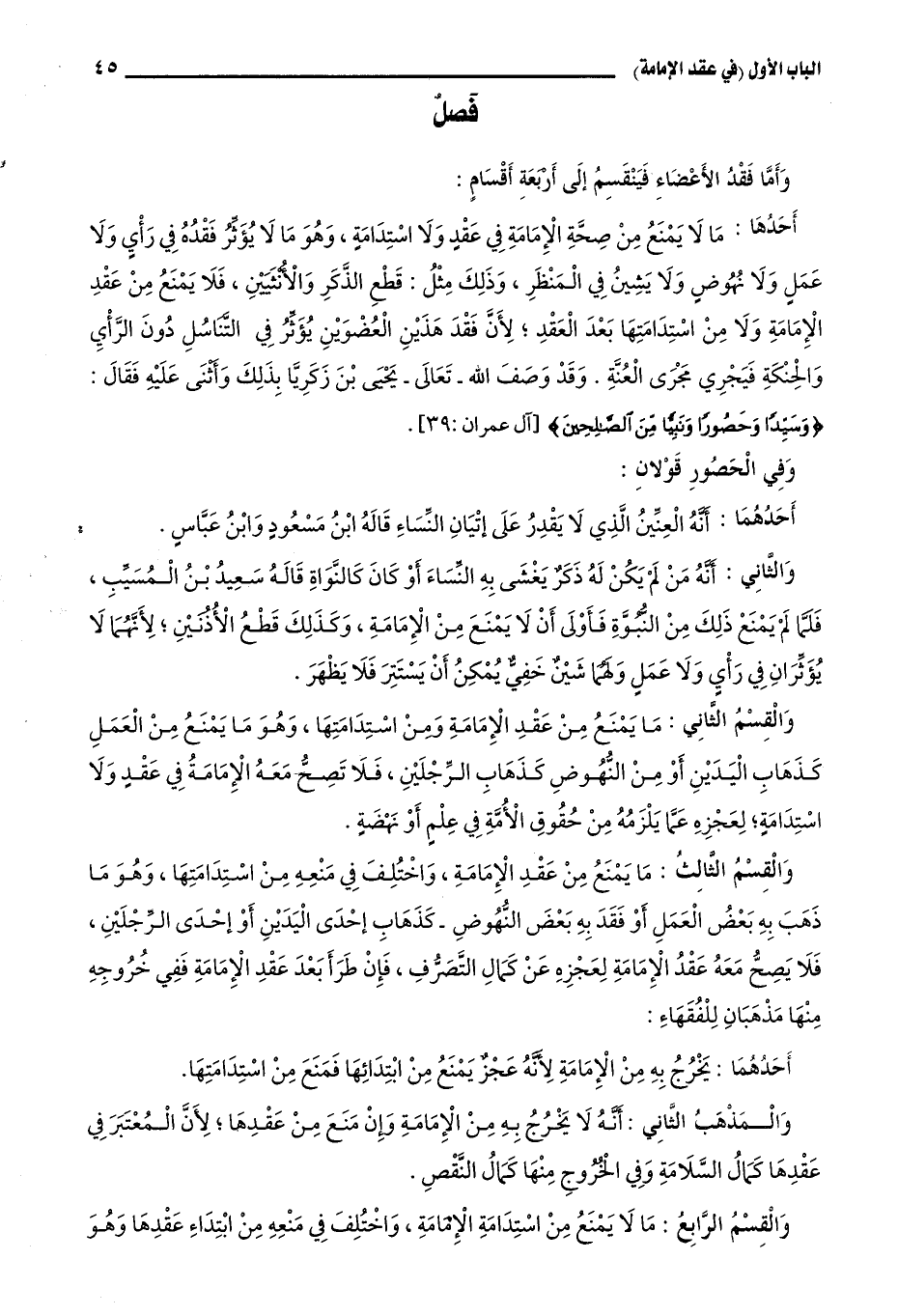 أَحَدُهَا: مَا لَا يَمْنَعُ مِنْ صِحَّةِ الْإِمَامَةِ فِي عَقْدٍ وَلَا اسْتِدَامَةٍ، وَهُوَ مَا لَا يُؤَثِّرُ فَقْدُهُ فِي رَأْيٍ وَلَا عَمَلٍ وَلَا نُهُوضٍ، وَلَا يَشِينُ فِي الْمَنْظَرِ، وَذَلِكَ مِثْلُ قَطْعِ الذَّكَرِ وَالْأُنْثَيَيْنِ، فَلَا يَمْنَعُ مِنْ عَقْدِ الْإِمَامَةِ وَلَا مِنِ اسْتِدَامَتِهَا بَعْدَ الْعَقْدِ؛ لِأَنَّ فَقْدَ هَذَيْنِ الْعُضْوَيْنِ يُؤَثِّرُ فِي التَّنَاسُلِ دُونَ الرَّأْيِ وَالْحِنْكَةِ، فَيَجْرِي مَجْرَى الْعُنَّةِ، وَقَدْ وَصَفَ اللَّهُ تَعَالَى يَحْيَى بْنَ زَكَرِيَّا بِذَلِكَ وَأَثْنَى عَلَيْهِ فَقَالَ: {وَسَيِّدًا وَحَصُورًا وَنَبِيًّا مِنَ الصَّالِحِينَ} [آل عمران: 39] .