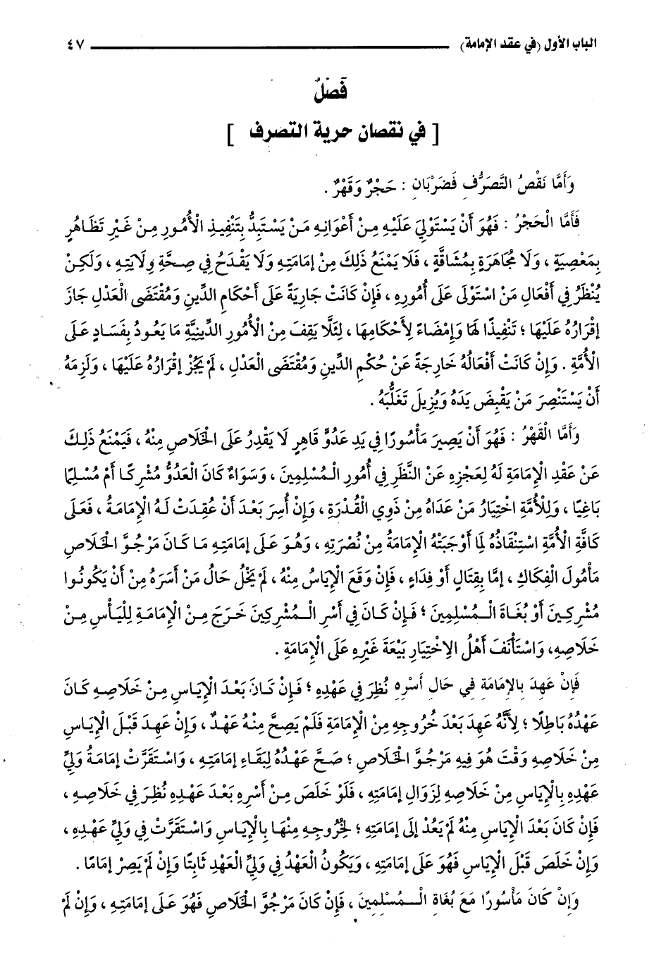 وَأَمَّا الْقَهْر: ُ فَهُوَ أَنْ يَصِيرَ مَأْسُورًا فِي يَدِ عَدُوٍّ قَاهِرٍ لَا يَقْدِرُ عَلَى الْخَلَاصِ مِنْهُ، فَيَمْنَعُ ذَلِكَ عَنْ عَقْدِ الْإِمَامَةِ لَهُ؛ لِعَجْزِهِ عَنِ النَّظَرِ فِي أُمُورِ الْمُسْلِمِينَ، وَسَوَاءٌ كَانَ الْعَدُوُّ مُشْرِكًا أَوْ مُسْلِمًا بَاغِيًا، وَلِلْأُمَّةِ اخْتِيَارُ مَنْ عَدَاهُ مِنْ ذَوِي الْقُدْرَةِ، وَإِنْ أُسِرَ بَعْدَ أَنْ عُقِدَتْ لَهُ الْإِمَامَةُ، فَعَلَى كَافَّةِ الْأُمَّةِ اسْتِنْقَاذُهُ لِمَا أَوْجَبَتْهُ الْإِمَامَةُ مِنْ نُصْرَتِهِ، وَهُوَ عَلَى إمَامَتِهِ مَا كَانَ مَرْجُوَّ الْخَلَاصِ مَأْمُولَ الْفِكَاكِ، إمَّا بِقِتَالٍ أَوْ فِدَاءٍ، فَإِنْ وَقَعَ الْإِيَاسُ مِنْهُ لَمْ يَخْلُ حَالُ مَنْ أَسَرَهُ مِنْ أَنْ يَكُونُوا مُشْرِكِينَ أَوْ بُغَاةَ الْمُسْلِمِينَ، فَإِنْ كَانَ فِي أَسْرِ الْمُشْرِكِينَ خَرَجَ مِنَ الْإِمَامَةِ لِلْيَأْسِ مِنْ خَلَاصِهِ، وَاسْتَأْنَفَ أَهْلُ الِاخْتِيَارِ بَيْعَةَ غَيْرِهِ عَلَى الْإِمَامَةِ.