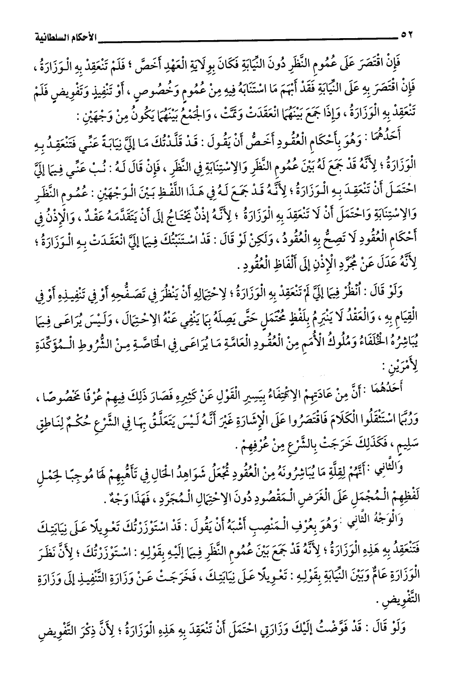 فَإِنِ اقْتَصَرَ عَلَى عُمُومِ النَّظَرِ دُونَ النِّيَابَةِ فَكَانَ بِوِلَايَةِ الْعَهْدِ أَخَصَّ؛ فَلَمْ تَنْعَقِدْ بِهِ الْوَزَارَةُ، فَإِنْ اقْتَصَرَ بِهِ عَلَى النِّيَابَةِ فَقَدْ أَبْهَمَ مَا اسْتَنَابَهُ فِيهِ مِنْ عُمُومٍ وَخُصُوصٍ أَوْ تَنْفِيذٍ وَتَفْوِيضٍ فَلَمْ تَنْعَقِدْ بِهِ الْوَزَارَةُ، وَإِذَا جَمَعَ بَيْنَهُمَا انْعَقَدَتْ وَتَمَّتْ، وَالْجَمْعُ بَيْنَهُمَا يَكُونُ مِنْ وَجْهَيْنِ:
