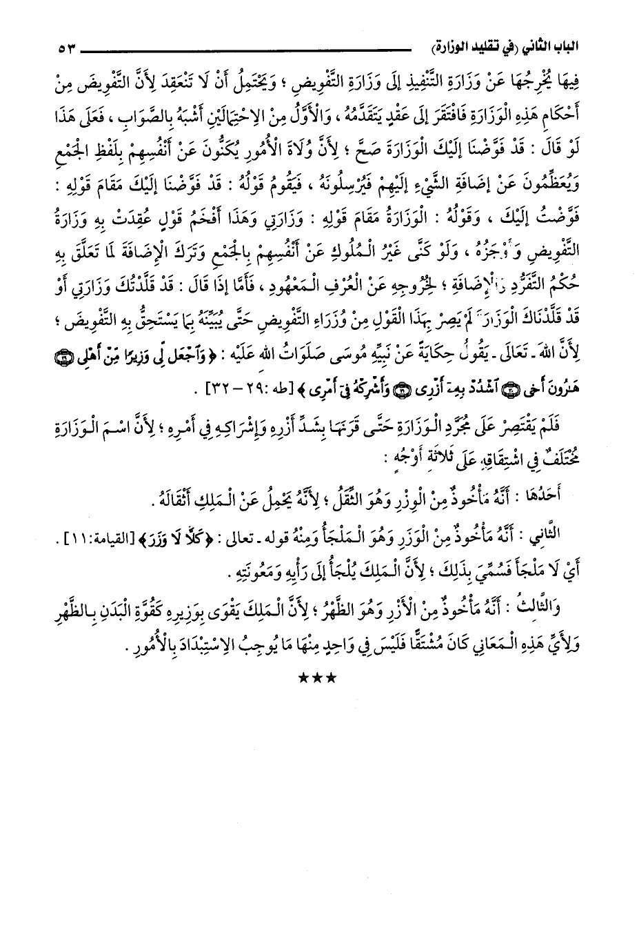 وَالثَّالِثُ: إِنَّهُ مَأْخُوذٌ مِنَ الْأَزْرِ وَهُوَ الظَّهْرُ؛ لِأَنَّ الْمَلِكَ يَقْوَى بِوَزِيرِهِ، كَقُوَّةِ الْبَدَنِ بِالظَّهْرِ، وَلِأَيِّ هَذِهِ الْمَعَانِي كَانَ مُشْتَقًّا فَلَيْسَ فِي وَاحِدٍ مِنْهَا مَا يُوجِبُ الِاسْتِبْدَادَ بِالْأُمُورِ.