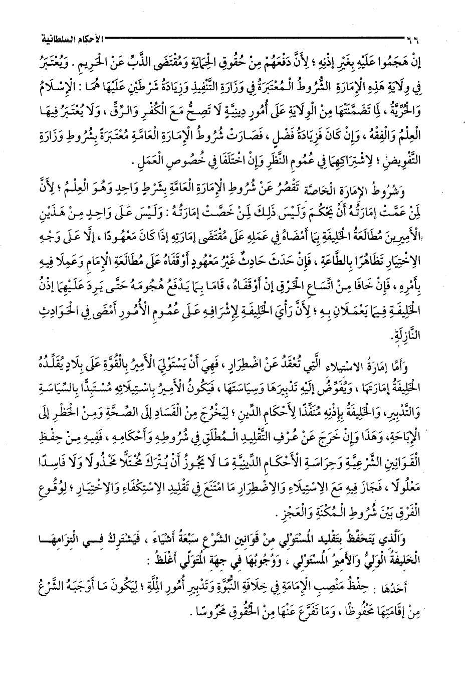 وَاَلَّذِي يَتَحَفَّظُ بِتَقْلِيدِ الْمُسْتَوْلِي مِنْ قَوَانِينِ الشَّرْعِ سَبْعَةُ أَشْيَاءَ، فَيَشْتَرِكُ فِي الْتِزَامِهَا الْخَلِيفَةُ الْوَلِيُّ وَالْأَمِيرُ الْمُسْتَوْلِي، وَوُجُوبُهَا فِي جِهَةِ الْمُتَوَلِّي أَغْلَظُ: