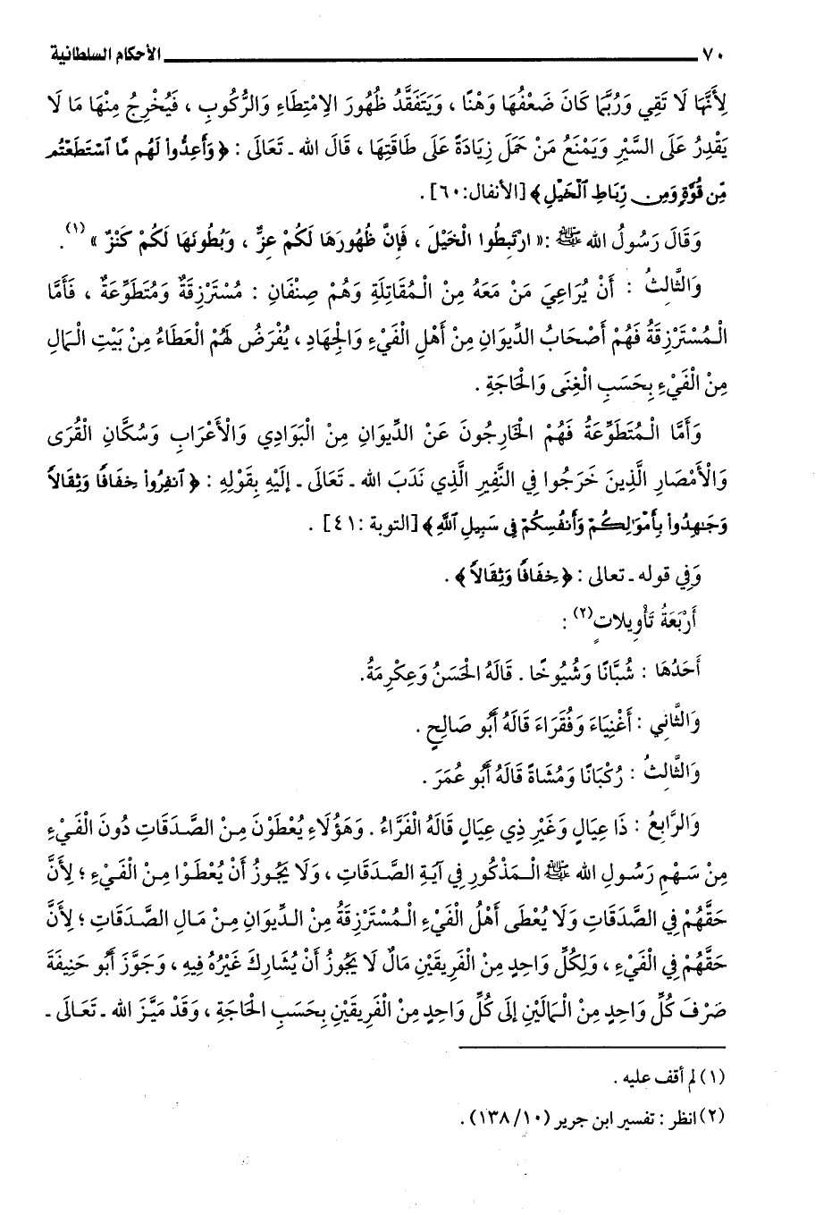 وَالثَّالِثُ: أَنْ يُرَاعِيَ مَنْ مَعَهُ مِنْ الْمُقَاتِلَةِ وَهُمْ صِنْفَانِ: مُسْتَرْزِقَةٌ وَمُتَطَوِّعَةٌ، فَأَمَّا الْمُسْتَرْزِقَةُ فَهُمْ أَصْحَابُ الدِّيوَانِ مِنْ أَهْلِ الْفَيْءِ وَالْجِهَادِ، يُفْرَضُ لَهُمْ الْعَطَاءُ مِنْ بَيْتِ الْمَالِ مِنْ الْفَيْءِ بِحَسَبِ الْغِنَى وَالْحَاجَةِ.