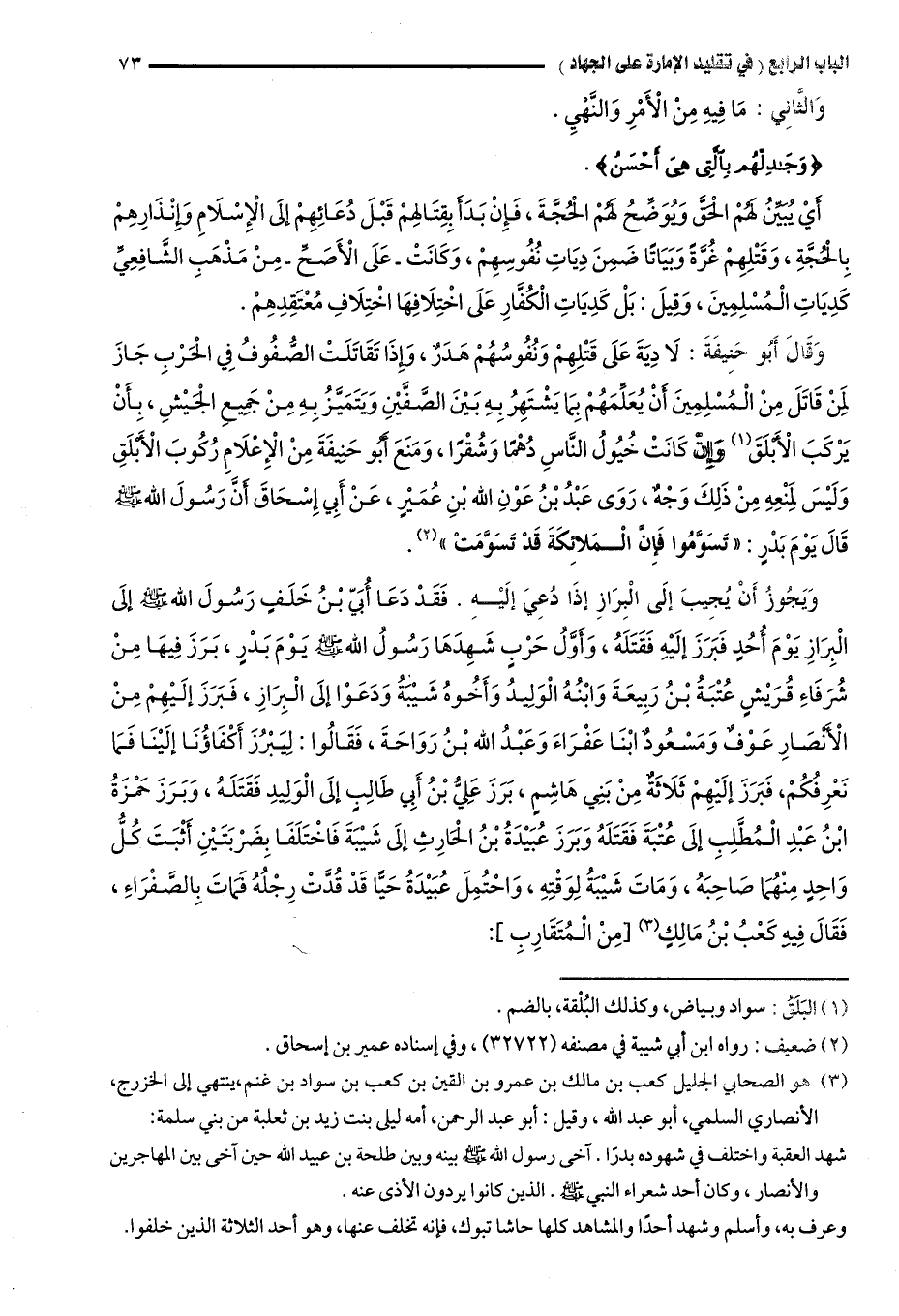 3 هو الصحابي الجليل كعب بن مالك بن عمرو بن القين بن كعب بن سواد بن غنم -ينتهي إلى الخزرج- الأنصاري السلمي، أبو عبد الله، وقيل: أبو عبد الرحمن، أمه ليلى بنت زيد بن ثعلبة من بني سلمة. شهد العقبة واختُلِفَ في شهوده بدرًا، آخى رسول الله -صلى الله عليه وسلم- بينه وبين طلحة بن عبيد الله حين آخى بين المهاجرين والأنصار، وكان أحد شعراء النبي -صلى الله عليه وسلم- الذين كانوا يردُّون الأذى عنه.