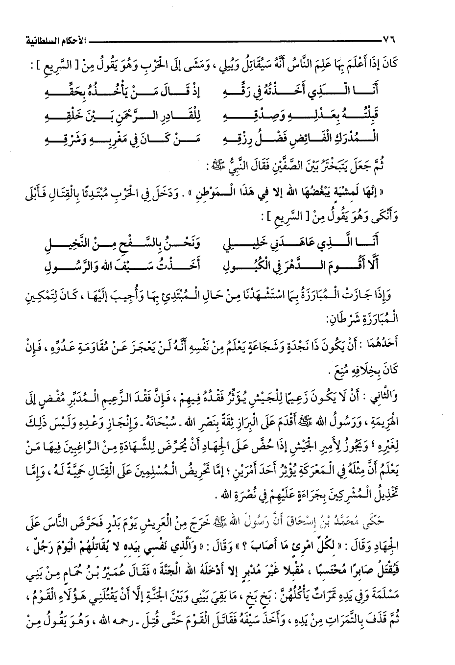 "إنَّهَا لَمِشْيَةٌ يَبْغُضُهَا اللَّهُ إلَّا فِي هَذَا الْمَوْطِنِ"، وَدَخَلَ فِي الْحَرْبِ مُبْتَدِئًا بِالْقِتَالِ، فَأَبْلَى وَأَنْكَى وَهُوَ يَقُولُ مِنَ السَّرِيعِ: