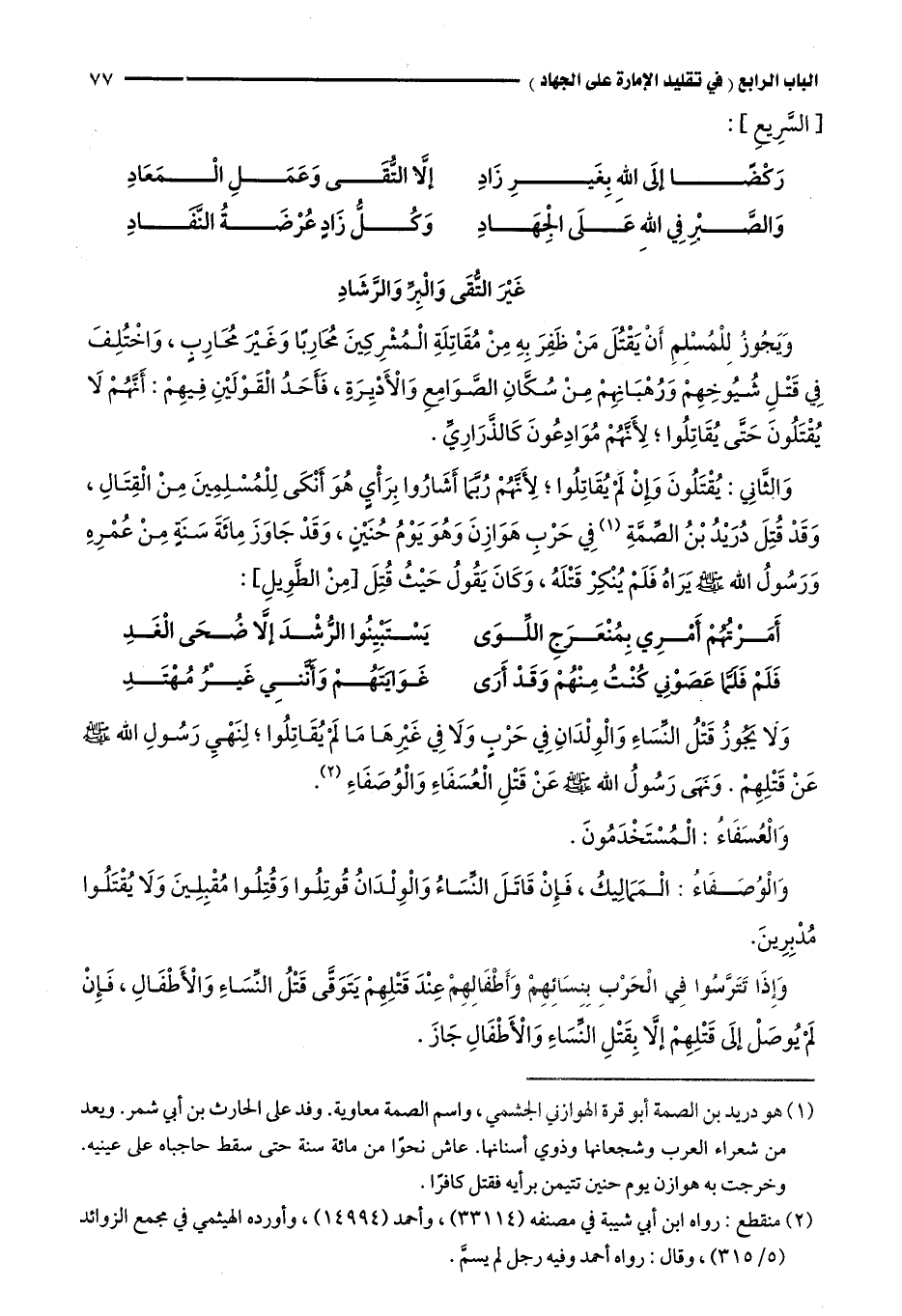 وَلَا يَجُوزُ قَتْلُ النِّسَاءِ وَالْوِلْدَانِ فِي حَرْبٍ وَلَا فِي غَيْرِهَا مَا لَمْ يُقَاتِلُوا؛ لِنَهْيِ رَسُولِ اللَّهِ -صَلَّى اللَّهُ عَلَيْهِ وَسَلَّمَ- عَنْ قَتْلِهِمْ. وَنَهَى رَسُولُ اللَّهِ -صَلَّى اللَّهُ عَلَيْهِ وَسَلَّمَ- عَنْ قَتْلِ الْعُسَفَاءِ وَالْوُصَفَاءِ2.