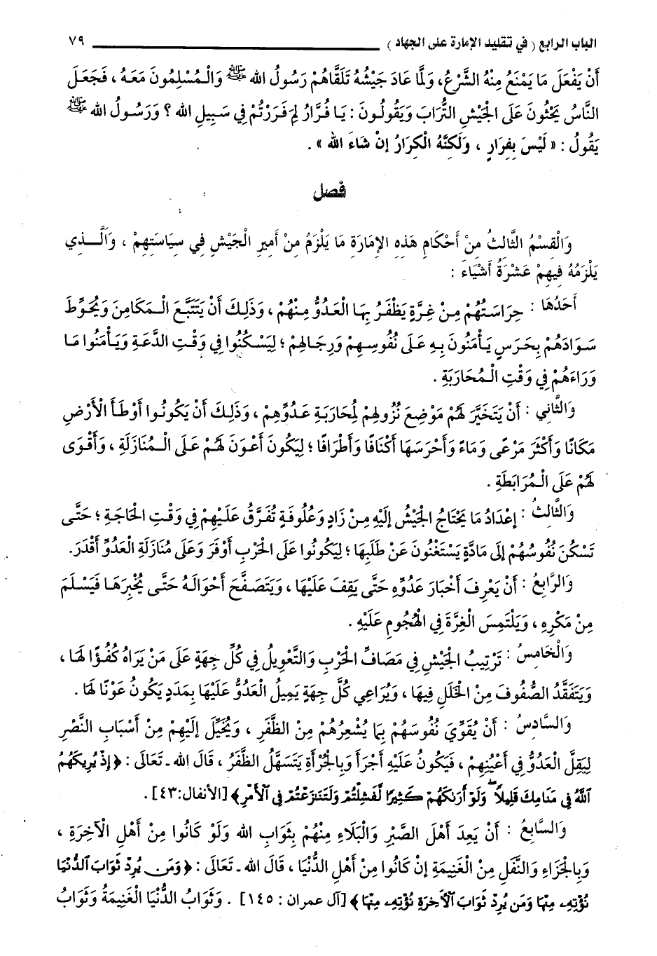 وَالْقِسْمُ الثَّالِثُ مِنْ أَحْكَامِ هَذِهِ الْإِمَارَةِ مَا يَلْزَمُ مِنْ أَمِيرِ الْجَيْشِ فِي سِيَاسَتِهِمْ، وَاَلَّذِي يَلْزَمُهُ فِيهِمْ عَشْرَةُ أَشْيَاءَ: