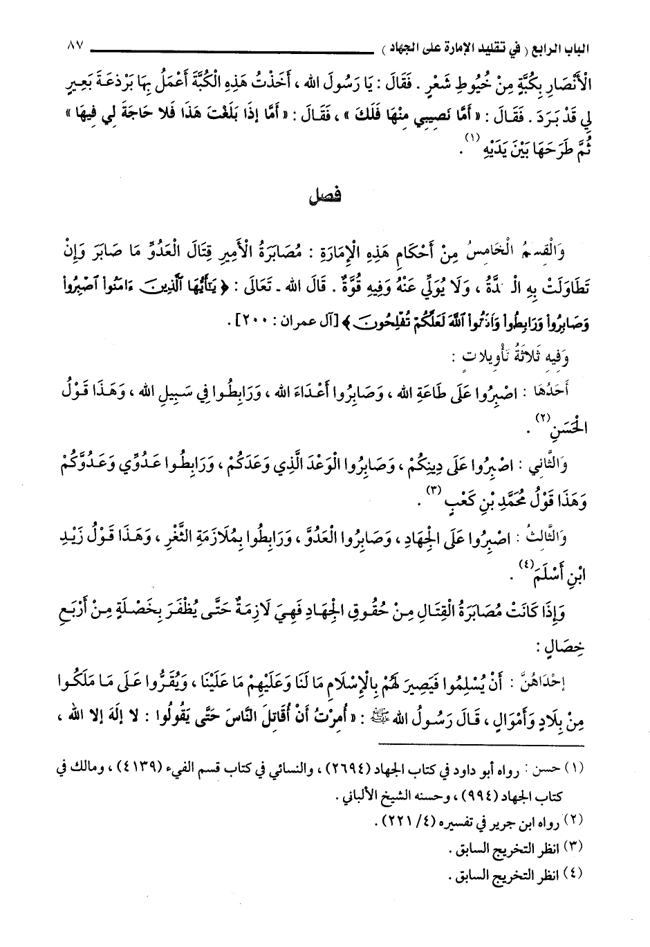 وَالْقِسْمُ الْخَامِسُ: مِنْ أَحْكَامِ هَذِهِ الْإِمَارَةِ: مُصَابَرَةُ الْأَمِيرِ قِتَالَ الْعَدُوِّ مَا صَابَرَ وَإِنْ تَطَاوَلَتْ بِهِ الْمُدَّةُ، وَلَا يُوَلِّي عَنْهُ وَفِيهِ قُوَّةٌ. قَالَ اللَّهُ تَعَالَى: {يَا أَيُّهَا الَّذِينَ آمَنُوا اصْبِرُوا وَصَابِرُوا وَرَابِطُوا وَاتَّقُوا اللَّهَ لَعَلَّكُمْ تُفْلِحُونَ} [آل عمران: 200] .