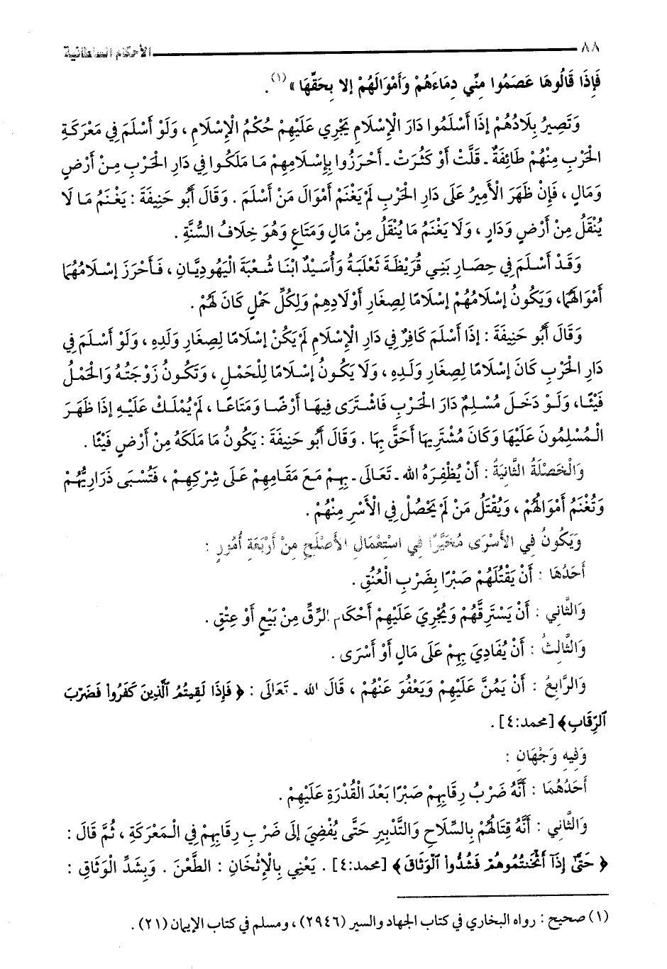 وَالثَّانِي: أَنَّهُ قِتَالُهُمْ بِالسِّلَاحِ وَالتَّدْبِيرِ حَتَّى يُفْضِيَ إلَى ضَرْبِ رِقَابِهِمْ فِي الْمَعْرَكَةِ، ثُمَّ قَالَ: {حَتَّى إذَا أَثْخَنْتُمُوهُمْ فَشُدُّوا الْوَثَاقَ} [محمد: 4] ، يَعْنِي بِالْإِثْخَانِ: الطَّعْنَ، وَبِشَدِّ الْوَثَاقِ: