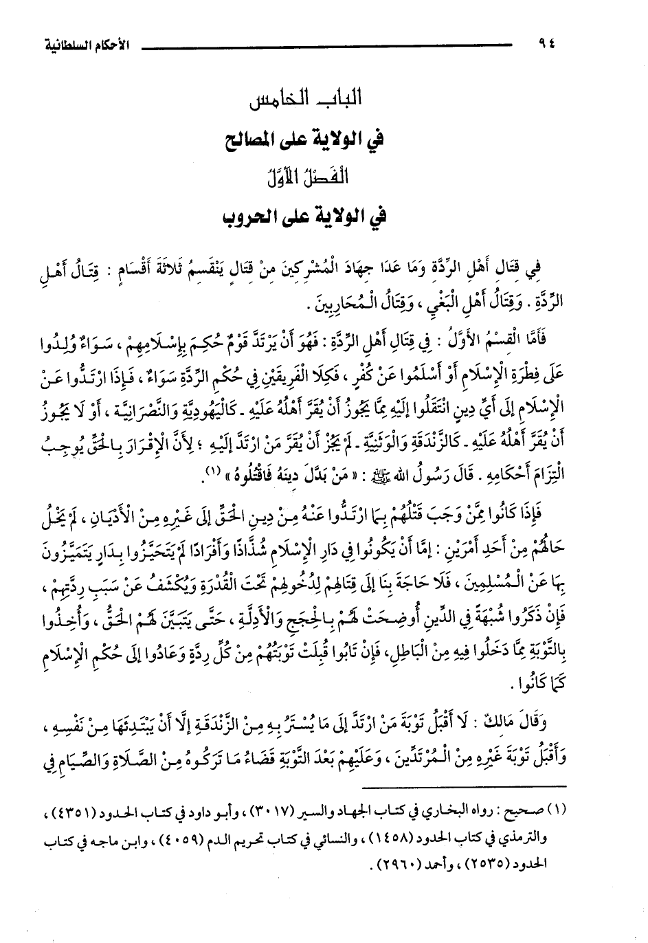 فِي قِتَالِ أَهْلِ الرِّدَّةِ وَمَا عَدَا جِهَادَ الْمُشْرِكِينَ مِنْ قِتَالٍ يَنْقَسِمُ ثَلَاثَةَ أَقْسَامٍ: قِتَالُ أَهْلِ الرِّدَّةِ، وَقِتَالُ أَهْلِ الْبَغْيِ، وَقِتَالُ الْمُحَارِبِينَ.