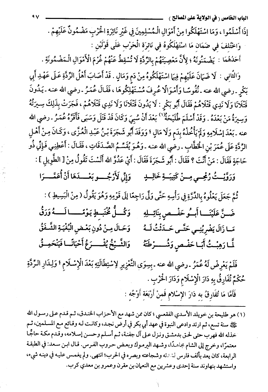 وَقَدْ أَسْلَمَ طُلَيْحَةُ1 بَعْدَ أَنْ سُبِيَ وَكَانَ قَدْ قَتَلَ وَسَبَى، فَأَقَرَّهُ عُمَرُ -رَضِيَ اللَّهُ عَنْهُ- بَعْدَ إسْلَامِهِ، وَلَمْ يَأْخُذْهُ بِدَمٍ وَلَا مَالٍ؛ وَوَفَدَ أَبُو شَجَرَةَ بْنُ عَبْدِ الْعُزَّى، وَكَانَ مِنْ أَهْلِ الرِّدَّةِ عَلَى عُمَرَ بْنِ الْخَطَّابِ -رَضِيَ اللَّهُ عَنْهُ- وَهُوَ يُقَسِّمُ الصَّدَقَاتِ، فَقَالَ: أَعْطِنِي فَإِنِّي ذُو حَاجَةٍ، فَقَالَ مَنْ أَنْتَ؟ فَقَالَ: أَبُو شَجَرَةَ، فَقَالَ: أَيْ عَدُوَّ اللَّهِ، أَلَسْتَ تَقُولُ "مِنَ الطَّوِيلِ":