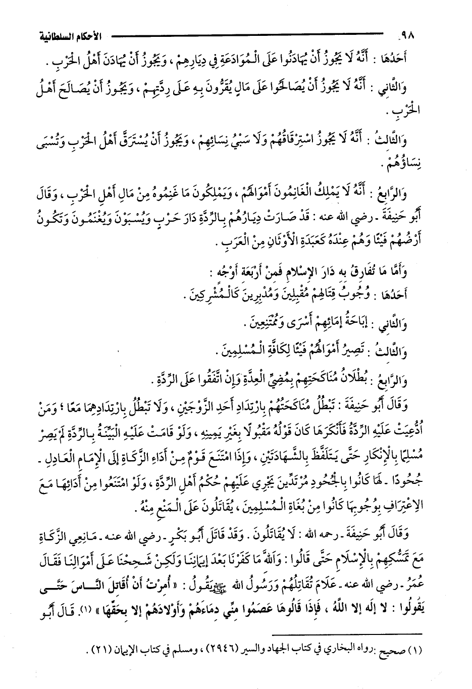 وَقَالَ أَبُو حَنِيفَةَ -رَحِمَهُ اللَّهُ: لَا يُقَاتَلُونَ. وَقَدْ قَاتَلَ أَبُو بَكْرٍ -رَضِيَ اللَّهُ عَنْهُ- مَانِعِي الزَّكَاةِ، مَعَ تَمَسُّكِهِمْ بِالْإِسْلَامِ حَتَّى قَالُوا: وَاَللَّهِ مَا كَفَرْنَا بَعْدَ إيمَانِنَا وَلَكِنْ شَحِحْنَا عَلَى أَمْوَالِنَا، فَقَالَ عُمَرُ -رَضِيَ اللَّهُ عَنْهُ: عَلَامَ تُقَاتِلُهُمْ وَرَسُولُ اللَّهِ -صَلَّى اللَّهُ عَلَيْهِ وَسَلَّمَ- يَقُولُ: "أُمِرْتُ أَنْ أُقَاتِلَ النَّاسَ حَتَّى يَقُولُوا لَا إلَه إلَّا اللَّهُ، فَإِذَا قَالُوهَا عَصَمُوا مِنِّي دِمَاءَهُمْ وَأَوْلَادَهُمْ إلَّا بِحَقِّهَا". قَالَ أَبُو