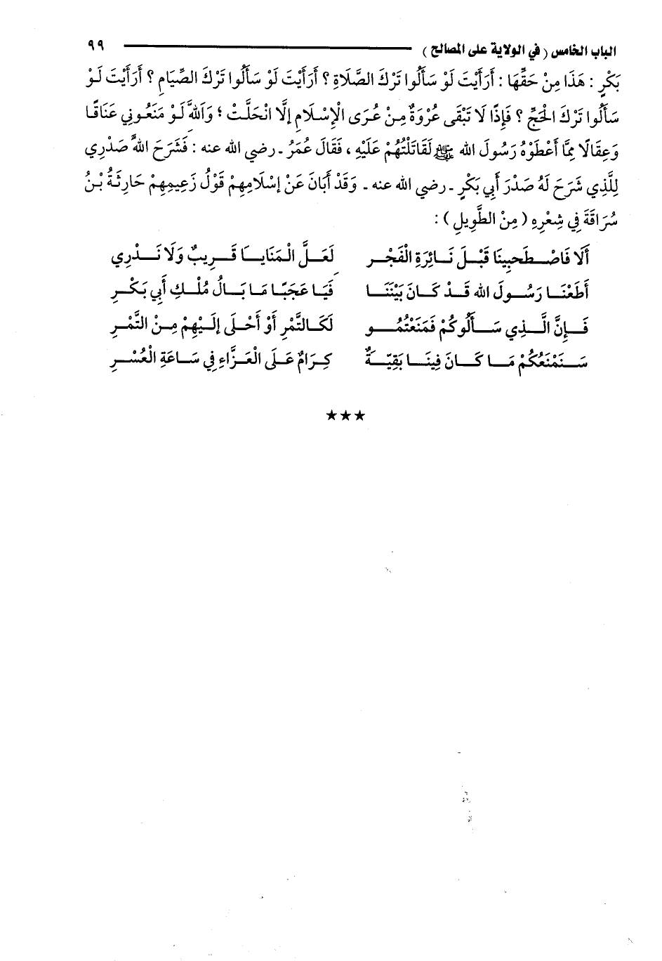بَكْرٍ: هَذَا مِنْ حَقِّهَا، أَرَأَيْتَ لَوْ سَأَلُوا تَرْكَ الصَّلَاةِ؟ أَرَأَيْتَ لَوْ سَأَلُوا تَرْكَ الصِّيَامِ؟ أَرَأَيْتَ لَوْ سَأَلُوا تَرْكَ الْحَجِّ؟ فَإِذًا لَا تَبْقَى عُرْوَةٌ مِنْ عُرَى الْإِسْلَامِ إلَّا انْحَلَّتْ؛ وَاَللَّهِ لَوْ مَنَعُونِي عَنَاقًا وَعِقَالًا مِمَّا أَعْطَوْهُ رَسُولَ اللَّهِ -صَلَّى اللَّهُ عَلَيْهِ وَسَلَّمَ- لَقَاتَلْتُهُمْ عَلَيْهِ، فَقَالَ عُمَرُ -رَضِيَ اللَّهُ عَنْهُ: فَشَرَحَ اللَّهُ صَدْرِي لِلَّذِي شَرَحَ لَهُ صَدْرَ أَبِي بَكْرٍ -رَضِيَ اللَّهُ عَنْهُ، وَقَدْ أَبَانَ عَنْ إسْلَامِهِمْ قَوْلُ زَعِيمِهِمْ حَارِثَةُ بْنُ سُرَاقَةَ فِي شِعْرِهِ "مِنَ الطَّوِيلِ":
