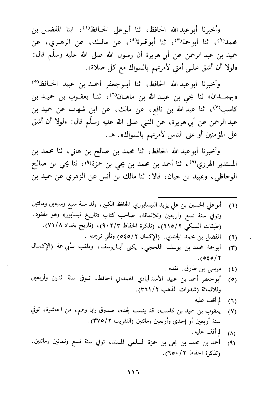 وَأَخْبَرَنَا أَبُو عَبْدِ اللَّهِ الْحَافِظُ ثنا أَبُو عَلِيٍّ الْحَافِظُ أبنا الْمُفَضَّلُ بْنُ مُحَمَّدِ ثنا أَبُو حِمَّةَ، ثنا أَبُو قُرَّةَ، عَنْ مَالِكٍ عَنِ الزُّهْرِيِّ عَنْ حُمَيْدِ بْنِ عَبْدِ الرَّحْمَنِ عَنْ أَبِي هُرَيْرَةَ: أَنَّ رَسُولَ اللَّهِ صَلَّى اللهُ عَلَيْهِ وَسَلَّمَ قَالَ: §«لَوْلَا أَنْ أَشُقَّ عَلَى أُمَّتِي لَأَمَرْتُهُمْ بِالسِّوَاكِ مَعَ كُلِّ صَلَاةٍ»