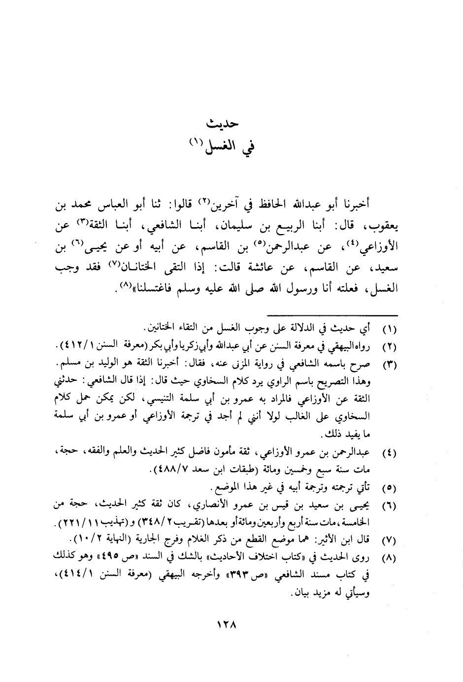 أَخْبَرَنَا أَبُو عَبْدِ اللَّهِ الْحَافِظُ، فِي آخَرِينَ، قَالُوا: ثنا أَبُو الْعَبَّاسِ مُحَمَّدُ بْنُ يَعْقُوبَ، قَالَ: أبنا الرَّبِيعُ بْنُ سُلَيْمَانَ أبنا الشَّافِعِيُّ أبنا الثِّقَةُ عَنِ الْأَوْزَاعِيِّ عَنْ عَبْدِ الرَّحْمَنِ بْنِ الْقَاسِمِ عَنْ أَبِيهِ أَوْ عَنْ يَحْيَى بْنِ سَعِيدٍ عَنِ الْقَاسِمِ عَنْ عَائِشَةَ قَالَتْ: §إِذَا الْتَقَى الْخِتَانَانِ فَقَدْ وَجَبَ الْغُسْلُ، فَعَلْتُهُ أَنَا وَرَسُولُ اللَّهِ صَلَّى اللهُ عَلَيْهِ وَسَلَّمَ فَاغْتَسَلْنَا -[129]- هَكَذَا رَوَاهُ الرَّبِيعُ عَنِ الشَّافِعِيِّ بِالشَّكِّ، وَرَوَاهُ الْمُزَنِيُّ، عَنِ الشَّافِعِيِّ، فَقَالَ: عَنْ عَبْدِ الرَّحْمَنِ بْنِ الْقَاسِمِ مِنْ غَيْرِ شَكٍّ. وَهُوَ فِيمَا كَتَبَ إِلَيَّ أَبُو نُعَيْمٍ الْإِسْفَرَايِينِيُّ أَنَّ أَبَا عَوَانَةَ أَخْبَرَهُمْ، ثنا الْمُزَنِيُّ، ثنا الشَّافِعِيُّ، ثنا الثِّقَةُ، عَنِ الْأَوْزَاعِيِّ، عَنْ عَبْدِ الرَّحْمَنِ بْنِ الْقَاسِمِ، وَكَذَلِكَ رَوَاهُ غَيْرُهُ عَنِ الْوَلِيدِ بْنِ مُسْلِمٍ، وَالْوَلِيدِ بْنِ مَزْيَدٍ، عَنِ الْأَوْزَاعِيِّ، عَنْ عَبْدِ الرَّحْمَنِ مِنْ غَيْرِ شَكٍّ