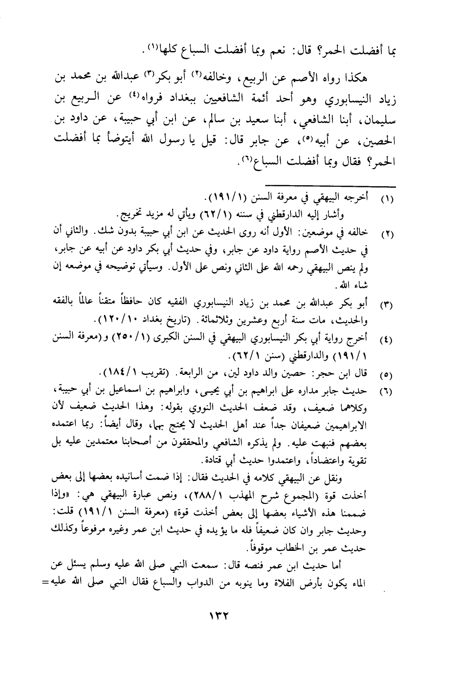 عَنِ الرَّبِيعِ بْنِ سُلَيْمَانَ، أبنا الشَّافِعِيُّ، أبنا سَعِيدُ بْنُ سَالِمٍ، عَنِ ابْنِ أَبِي حَبِيبَةَ، عَنْ دَاوُدَ بْنِ الْحُصَيْنِ، عَنْ أَبِيهِ، عَنْ جَابِرٍ، قَالَ: قِيلَ يَا رَسُولَ اللَّهِ: أَيُتَوَضَّأُ بِمَا أَفْضَلَتِ الْحُمُرُ؟ فَقَالَ: §«وَبِمَا أَفْضَلَتِ السِّبَاعُ» -[133]- أَخْبَرَنَا أَبُو بَكْرِ بْنُ الْحَارِثِ الْأَصْبَهَانِيُّ الْفَقِيهُ أبنا عَلِيُّ بْنُ عُمَرَ الْحَافِظُ ثنا أَبُو بَكْرٍ النَّيْسَابُورِيُّ ثنا الرَّبِيعُ بْنُ سُلَيْمَانَ، فَذَكَرَهُ وَهَذَا هُوَ الصَّحِيحُ مِنْ غَيْرِ شَكٍّ، وَابْنُ أَبِي حَبِيبَةَ هُوَ إِبْرَاهِيمُ بْنُ -[134]- إِسْمَاعِيلَ الْأَشْهَلِيُّ، وَأَكَّدَهُ الشَّافِعِيُّ بِرِوَايَةِ إِبْرَاهِيمَ بْنِ أَبِي يَحْيَى، عَنْ دَاوُدَ بْنِ الْحُصَيْنِ، عَنْ أَبِيهِ، عَنْ جَابِرٍ