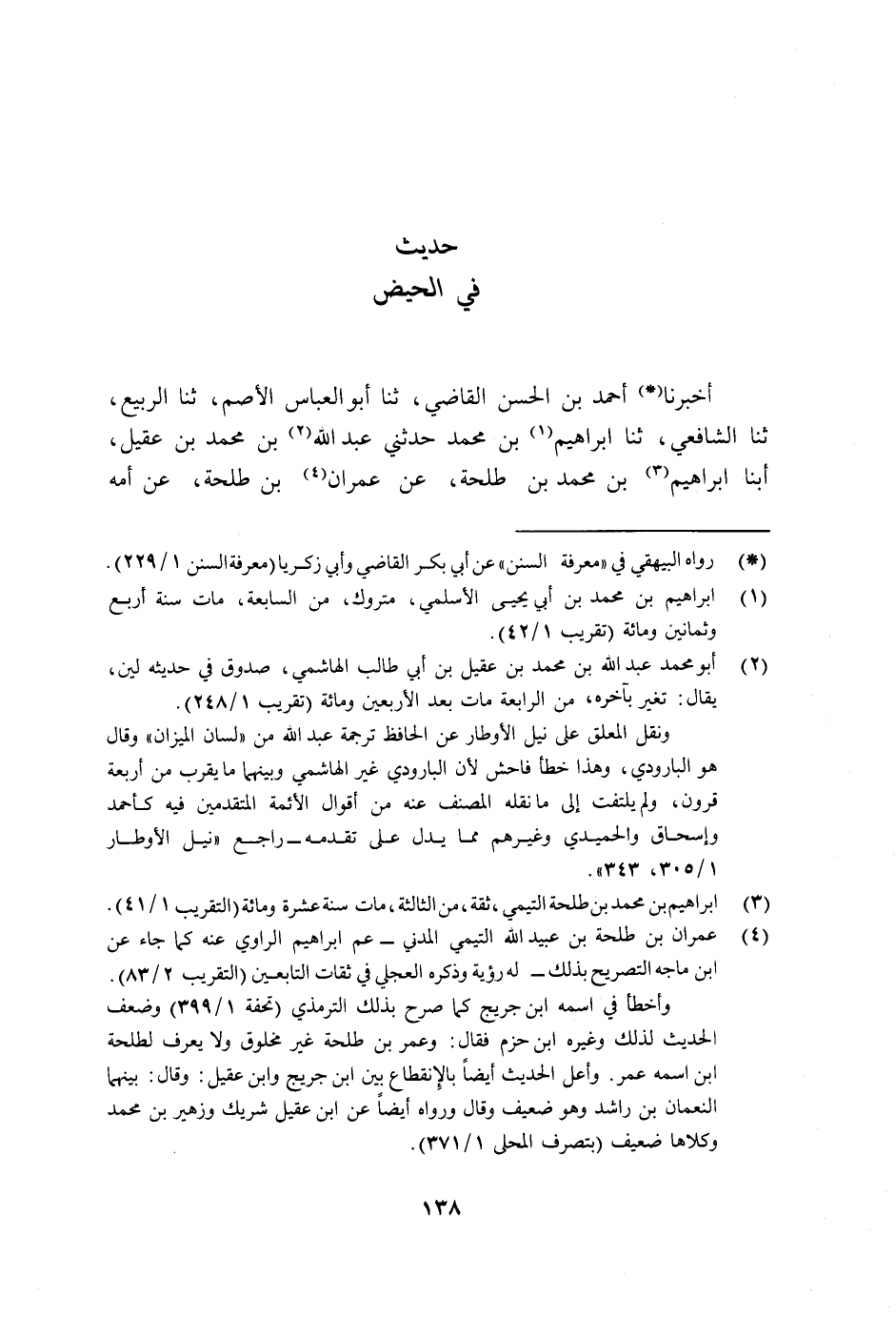 أَخْبَرَنَا أَحْمَدُ بْنُ الْحَسَنِ الْقَاضِي ثنا أَبُو الْعَبَّاسِ الْأَصَمُّ ثنا الرَّبِيعُ ثنا الشَّافِعِيُّ ثنا إِبْرَاهِيمُ بْنُ مُحَمَّدِ حَدَّثَنِي عَبْدُ اللَّهِ بْنُ مُحَمَّدِ بْنِ عَقِيلٍ أبنا إِبْرَاهِيمُ بْنُ مُحَمَّدِ بْنِ طَلْحَةَ عَنْ عِمْرَانَ بْنِ طَلْحَةَ عَنْ أُمِّهِ، حَمْنَةَ بِنْتِ جَحْشٍ، قَالَتْ: كُنْتُ أُسْتَحَاضُ حَيْضَةً كَبِيرَةً شَدِيدَةً، فَجِئْتُ إِلَى النَّبِيِّ صَلَّى اللهُ عَلَيْهِ وَسَلَّمَ أَسْتَفْتِيهِ فَوَجَدْتُهُ فِي بَيْتِ أُخْتِي زَيْنَبَ، فَقُلْتُ: يَا رَسُولَ اللَّهِ: إِنَّ لِيَ إِلَيْكَ حَاجَةً وَإِنَّهُ لِحَدِيثٌ مَا مِنْهُ بُدٌّ، وَإِنِّي لَأَسْتَحِي مِنْهُ، فَقَالَ: «مَا هُوَ يَا هَنْتَاهُ» فَقَالَتْ: إِنِّي امْرَأَةٌ أُسْتَحَاضُ حَيْضَةً كَثِيرَةً شَدِيدَةً فَمَا تَرَى فِيهَا فَقَدْ مَنَعْتَنِي الصَّلَاةَ وَالصَّوْمَ؟ فَقَالَ النَّبِيُّ صَلَّى اللهُ عَلَيْهِ وَسَلَّمَ: «§إِنِّي أَنْعَتُ لَكِ الْكُرْسُفَ فَإِنَّهُ يُذْهِبُ الدَّمَ» قَالَتْ: هُوَ أَكْثَرُ مِنْ ذَلِكَ، قَالَ النَّبِيُّ صَلَّى اللهُ عَلَيْهِ وَسَلَّمَ: «فَتَلَجَّمِي» قَالَتْ: هُوَ أَكْثَرُ مِنْ ذَلِكَ، قَالَ: «فَاتَّخِذِي ثَوْبًا» قَالَتْ: هُوَ أَكْثَرُ مِنْ ذَلِكَ إِنَّمَا أَثُجُّ ثَجًّا، فَقَالَ النَّبِيُّ صَلَّى اللهُ عَلَيْهِ وَسَلَّمَ: «سَآمُرُكِ بِأَمْرَيْنِ أَيُّهُمَا فَعَلْتِ أَجْزَأَكِ مِنَ الْآخَرِ، فَإِنْ قَوِيتِ عَلَيْهِمَا فَأَنْتِ أَعْلَمُ» قَالَ لَهَا: «إِنَّمَا هِيَ رَكْضَةٌ مِنْ رَكَضَاتِ الشَّيْطَانِ، فَتَحَيَّضِي سِتَّةَ أَيَّامٍ أَوْ سَبْعَةَ أَيَّامٍ فِي عِلْمِ اللَّهِ، ثُمَّ اغْتَسِلِي حَتَّى إِذَا رَأَيْتِ أَنَّكِ قَدْ طَهُرْتِ وَاسْتَنْقَيْتِ فَصَلِّي أَرْبَعًا وَعِشْرِينَ لَيْلَةً وَأَيَّامَهَا، أَوْ ثَلَاثًا وَعِشْرِينَ لَيْلَةً وَأَيَّامَهَا، أَوْ صَوْمِي فَإِنَّهُ يُجْزِئُكِ، وَكَذَلِكَ فَافْعَلِي فِي كُلِّ شَهْرٍ كَمَا يَحِيضُ النِّسَاءُ وَكَمَا يَطْهُرْنَ مِيقَاتَ حَيْضِهِنَّ وَطُهْرِهِنَّ» قَالَ الشَّافِعِيُّ عَقِيبَ هَذَا فِي غَيْرِ حَدِيثِ أَبِي بَكْرٍ: هَذَا يَدُلُّ عَلَى أَنَّهَا كَانَتْ تَعْرِفُ أَيَّامَ حَيْضِهَا سِتًّا أَوْ سَبْعًا، فَلِذَلِكَ قَالَ لَهَا رَسُولُ اللَّهِ صَلَّى اللهُ عَلَيْهِ وَسَلَّمَ، يَعْنِي مَا قَالَ، ثُمَّ عَادَ إِلَى الْحَدِيثِ قَالَ: «وَإِنْ قَوِيتِ أَنْ تُؤَخِّرِيَ الظُّهْرَ وَتُعَجِّلِي الْعَصْرَ وَتَغْتَسِلِي حَتَّى تَطْهُرِي ثُمَّ تُصَلِّيَنَّ الظُّهْرَ وَالْعَصْرَ جَمِيعًا، ثُمَّ تُؤَخِّرِينَ الْمَغْرِبَ وَتُعَجِّلِينَ الْعِشَاءَ ثُمَّ تَغْتَسِلِينَ وَتَجْمَعِينَ بَيْنَ الْمَغْرِبِ وَالْعِشَاءِ فَافْعَلِي، وَتَغْتَسِلِي عِنْدَ الْفَجْرِ ثُمَّ تُصَلِّيَنَّ الصُّبْحَ، فَكَذَلِكَ فَافْعَلِي وَصُومِي إِنْ قَوِيتِ عَلَى ذَلِكَ» فَقَالَ رَسُولُ اللَّهِ صَلَّى اللهُ عَلَيْهِ وَسَلَّمَ: «هَذَا أَحَبُّ الْأَمْرَيْنِ إِلَيَّ» هَكَذَا رَوَاهُ الشَّافِعِيُّ فِي كِتَابِ الْحَيْضِ، وَهُوَ مِنْ قَوْلِهِ: «وَإِنْ قَوِيتِ» إِلَى آخِرِهِ مِنَ الْحَدِيثِ، إِلَّا أَنَّ أَبَا عَمْرِو بْنَ مَطَرٍ أَوْ غَيْرَهُ لَمْ يَنْقُلْهُ مِنْ كِتَابِ أَبِي الْعَبَّاسِ إِلَى الْمُسْنَدِ، وَكَأَنَّهُ ظَنَّ أَنَّهُ مِنْ كَلَامِ الشَّافِعِيِّ، وَإِنَّمَا كَلَامُ الشَّافِعِيِّ مَا أَضَفْنَا إِلَيْهِ فَقَطْ أَخْبَرَنَا أَبُو عَبْدِ اللَّهِ الْحَافِظُ أبنا عَبْدُ اللَّهِ بْنُ الْحُسَيْنِ الْقَاضِي ثنا الْحَارِثُ بْنُ أَبِي أُسَامَةَ ثنا زَكَرِيَّا بْنُ عَدِيٍّ ثنا عُبَيْدُ اللَّهِ بْنُ عَمْرٍو الرَّقِّيُّ عَنْ عَبْدِ اللَّهِ بْنِ مُحَمَّدِ بْنِ عَقِيلٍ، فَذَكَرَهُ بِإِسْنَادِهِ وَمَعْنَاهُ، وَجَعَلَ قَو