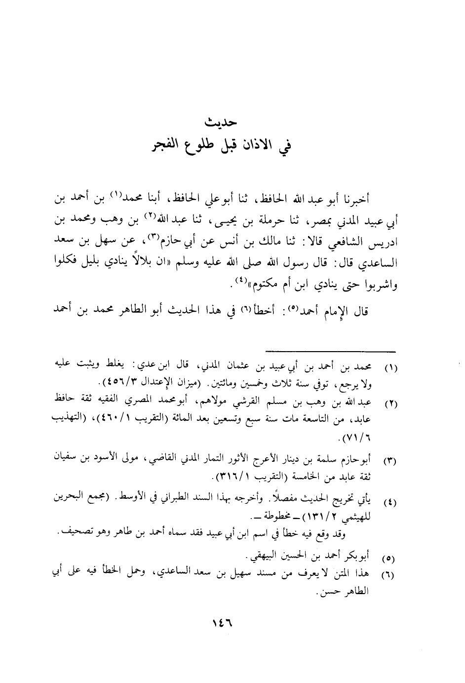 أَخْبَرَنَا أَبُو عَبْدِ اللَّهِ الْحَافِظُ ثنا أَبُو عَلِيٍّ الْحَافِظُ أبنا مُحَمَّدُ بْنُ أَحْمَدَ بْنِ أَبِي عُبَيْدٍ الْمَدَنِيُّ بِمِصْرَ، ثنا حَرْمَلَةُ بِنُ يَحْيَى ثنا عَبْدُ اللَّهِ بْنُ وَهْبٍ وَمُحَمَّدُ بْنُ إِدْرِيسَ الشَّافِعِيُّ قَالَا: ثنا مَالِكُ بْنُ أَنَسٍ عَنْ أَبِي حَازِمٍ عَنْ سَهْلِ بْنِ سَعْدٍ السَّاعِدِيِّ قَالَ: قَالَ رَسُولُ اللَّهِ صَلَّى اللهُ عَلَيْهِ وَسَلَّمَ: §«إِنَّ بِلَالًا يُنَادِي بِلَيْلٍ فَكُلُوا وَاشْرَبُوا حَتَّى يُنَادِيَ ابْنُ أُمِّ مَكْتُومٍ» قَالَ الْإِمَامُ أَحْمَدُ: أَخْطَأَ فِي هَذَا الْحَدِيثِ أَبُو الطَّاهِرِ مُحَمَّدُ بْنُ أَحْمَدَ -[147]- هَذَا وَكَانَ كَثِيرَ الْغَلَطِ، إِنَّمَا رَوَاهُ عَبْدُ اللَّهِ بْنُ وَهْبٍ، عَنِ الزُّهْرِيِّ، عَنْ سَالِمِ بْنِ عَبْدِ اللَّهِ بْنِ عُمَرَ، عَنْ أَبِيهِ، عَنِ النَّبِيِّ صَلَّى اللهُ عَلَيْهِ وَسَلَّمَ مَوْصُولًا وَتَابَعَهُ عَلَى وَصْلِهِ رَوْحُ بْنُ عُبَادَةَ، وَعَبْدُ الرَّزَّاقِ، وَالْقَعْنَبِيُّ، وَكَامِلُ بْنُ طَلْحَةَ، وَأَخْرَجَهُ الْبُخَارِيُّ فِي الصَّحِيحِ عَنِ الْقَعْنَبِيِّ، وَرَوَاهُ الشَّافِعِيُّ رَضِيَ اللَّهُ عَنْهُ وَجَمَاعَةٌ مِنْ أَصْحَابِ الْمُوَطَّأِ، عَنْ مَالِكٍ، عَنِ الزُّهْرِيِّ، عَنْ سَالِمٍ، عَنِ النَّبِيِّ صَلَّى اللهُ عَلَيْهِ وَسَلَّمَ مُرْسَلًا