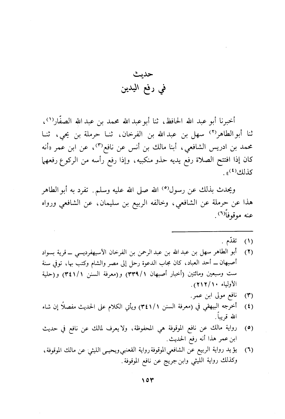 أَخْبَرَنَا أَبُو عَبْدِ اللَّهِ الْحَافِظُ ثنا أَبُو عَبْدِ اللَّهِ مُحَمَّدُ بْنُ عَبْدِ اللَّهِ الصَّفَّارُ، ثنا أَبُو الطَّاهِرِ سَهْلُ بْنُ عَبْدِ اللَّهِ بْنِ الْفَرْخَانِ ثنا حَرْمَلَةُ بْنُ يَحْيَى ثنا مُحَمَّدُ بْنُ إِدْرِيسَ الشَّافِعِيُّ أبنا مَالِكُ بْنُ أَنَسٍ عَنْ نَافِعٍ عَنِ ابْنِ عُمَرَ، أَنَّهُ كَانَ §إِذَا افْتَتَحَ الصَّلَاةَ رَفَعَ يَدَيْهِ حَذْوَ مَنْكِبَيْهِ، وَإِذَا رَفَعَ رَأْسَهُ مِنَ الرُّكُوعِ رَفَعَهُمَا كَذَلِكَ وَيُحَدِّثُ بِذَلِكَ عَنْ رَسُولِ اللَّهِ صَلَّى اللهُ عَلَيْهِ وَسَلَّمَ، تَفَرَّدَ بِهِ أَبُو الطَّاهِرِ هَذَا عَنْ حَرْمَلَةَ، عَنِ الشَّافِعِيِّ، وَخَالَفَهُ الرَّبِيعُ بْنُ سُلَيْمَانَ، عَنِ الشَّافِعِيِّ، وَرَوَاهُ عَنْهُ مَوْقُوفًا