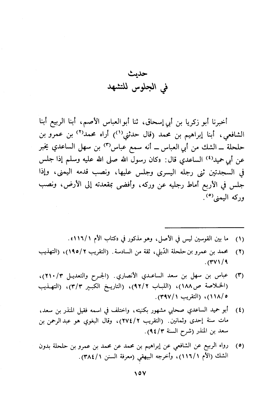 أَخْبَرَنَا أَبُو زَكَرِيَّا بْنُ أَبِي إِسْحَاقَ ثنا أَبُو الْعَبَّاسِ الْأَصَمُّ، أبنا الرَّبِيعُ، أبنا الشَّافِعِيُّ أبنا إِبْرَاهِيمُ بْنُ مُحَمَّدٍ. قَالَ: حَدَّثَنِي أُرَاهُ مُحَمَّدُ بْنُ عَمْرِو بْنِ حَلْحَلَةَ - الشَّكُّ مِنْ أَبِي الْعَبَّاسِ - أَنَّهُ سَمِعَ عَبَّاسَ بْنَ سَهْلٍ السَّاعِدِيَّ، يُخْبِرُ عَنْ أَبِي حُمَيْدٍ السَّاعِدِيِّ قَالَ: §كَانَ رَسُولُ اللَّهِ صَلَّى اللهُ عَلَيْهِ وَسَلَّمَ إِذَا جَلَسَ فِي السَّجْدَتَيْنِ ثَنَى رِجْلَهُ الْيُسْرَى وَجَلَسَ عَلَيْهَا، وَنَصَبَ قَدَمَهُ الْيُمْنَى، وَإِذَا جَلَسَ فِي الْأَرْبَعِ أَمَاطَ رِجْلَيْهِ عَنْ وَرِكِهِ، وَأَفْضَى بِمَقْعَدَتِهِ إِلَى الْأَرْضِ، وَنَصَبَ وَرِكِهِ الْيُمْنَى -[158]- هَكَذَا وَقَعَ هَذَا الْحَدِيثُ فِي كِتَابِ الرَّبِيعِ، وَشَكَّ فِيهِ أَبُو الْعَبَّاسِ. وَقَدْ رَوَاهُ الْحَسَنُ بْنُ مُحَمَّدِ بْنِ الصَّبَّاحِ الزَّعْفَرَانِيُّ فِي كِتَابِ الْقَدِيمِ، عَنِ الشَّافِعِيِّ، عَنْ رَجُلٍ، وَهُوَ إِبْرَاهِيمُ بْنُ مُحَمَّدٍ، عَنْ مُحَمَّدِ بْنِ عَمْرِو بْنِ حَلْحَلَةَ، عَنْ مُحَمَّدِ بْنِ عَمْرِو بْنِ عَطَاءٍ، عَنْ أَبِي حُمَيْدٍ السَّاعِدِيِّ: أَنَّ النَّبِيَّ صَلَّى اللهُ عَلَيْهِ وَسَلَّمَ جَلَسَ فِي الرَّابِعَةِ فَأَخْرَجَ رِجْلَيْهِ مِنْ قِبَلِ شِقِّهِ الْأَيْمَنِ وَأَفْضَى بِمَقْعَدَتِهِ عَلَى الْأَرْضِ أَخْبَرَنَا أَبُو الْحُسَيْنِ عَلِيُّ بْنُ مُحَمَّدِ بْنِ عَبْدِ اللَّهِ بْنِ بِشْرَانَ، بِبَغْدَادَ، أبنا أَبُو الْحَسَنِ عَلِيُّ بْنُ مُحَمَّدٍ الْمِصْرِيُّ، ثنا مِقْدَامُ بْنُ دَاوُدَ ثنا وَهْبُ بْنُ -[159]- الْمُبَارَكِ أبنا ابْنُ لَهِيعَةَ، ح قَالَ: وَثَنًا أَبُو الْأَسْوَدِ ثنا اللَّيْثُ بْنُ سَعْدٍ، وَابْنُ لَهِيعَةَ، عَنْ يَزِيدَ بْنِ أَبِي حَبِيبٍ، عَنْ مُحَمَّدِ بْنِ عَمْرِو بْنِ حَلْحَلَةَ، عَنْ مُحَمَّدِ بْنِ عَمْرِو بْنِ عَطَاءٍ قَالَ: كُنْتُ فِي مَجْلِسٍ مِنْ أَصْحَابِ رَسُولِ اللَّهِ صَلَّى اللهُ عَلَيْهِ وَسَلَّمَ فَتَذَاكَرُوا صَلَاتَهُ، فَقَالَ أَبُو حُمَيْدٍ السَّاعِدِيُّ: أَنَا أَعْلَمُكُمْ بِصَلَاةِ رَسُولِ اللَّهِ صَلَّى اللهُ عَلَيْهِ وَسَلَّمَ وَكَانَتْ مِنْ هِمَّتِي، رَأَيْتُ رَسُولَ اللَّهِ صَلَّى اللهُ عَلَيْهِ وَسَلَّمَ إِذَا قَامَ إِلَى الصَّلَاةَ كَبَّرَ، فَذَكَرَ الْحَدِيثَ وَقَالَ فِيهِ: فَإِذَا قَعَدَ فِي الرَّكْعَتَيْنِ قَعَدَ عَلَى بَطْنِ قَدَمِهِ الْيُسْرَى، وَنَصَبَ الْيُمْنَى، فَإِذَا كَانَتِ الرَّابِعَةُ أَفْضَى بِوَرِكِهِ الْيُسْرَى إِلَى الْأَرْضِ، وَأَخْرَجَ قَدَمَيْهِ مِنْ نَاحِيَةٍ وَاحِدَةٍ -[161]- أَخْرَجَهُ الْبُخَارِيُّ فِي الصَّحِيحِ مِنْ حَدِيثِ اللَّيْثِ بْنِ سَعْدٍ، وَأَمَّا حَدِيثُ عَبَّاسِ بْنِ سَهْلٍ، فَإِبْرَاهِيمُ بْنُ مُحَمَّدٍ إِنَّمَا يَرْوِيهِ، عَنْ إِسْحَاقَ بْنِ عَبْدِ اللَّهِ عَنْ عَبَّاسٍ لَا عَنْ مُحَمَّدِ بْنِ عَمْرِو بْنِ حَلْحَلَةَ، فَإِسْنَادُ حَدِيثِهِ فِي رِوَايَةِ الرَّبِيعِ خَطَأٌ وَالصَّوَابُ رِوَايَةُ الزَّعْفَرَانِيِّ وَاللَّهُ أَعْلَمُ