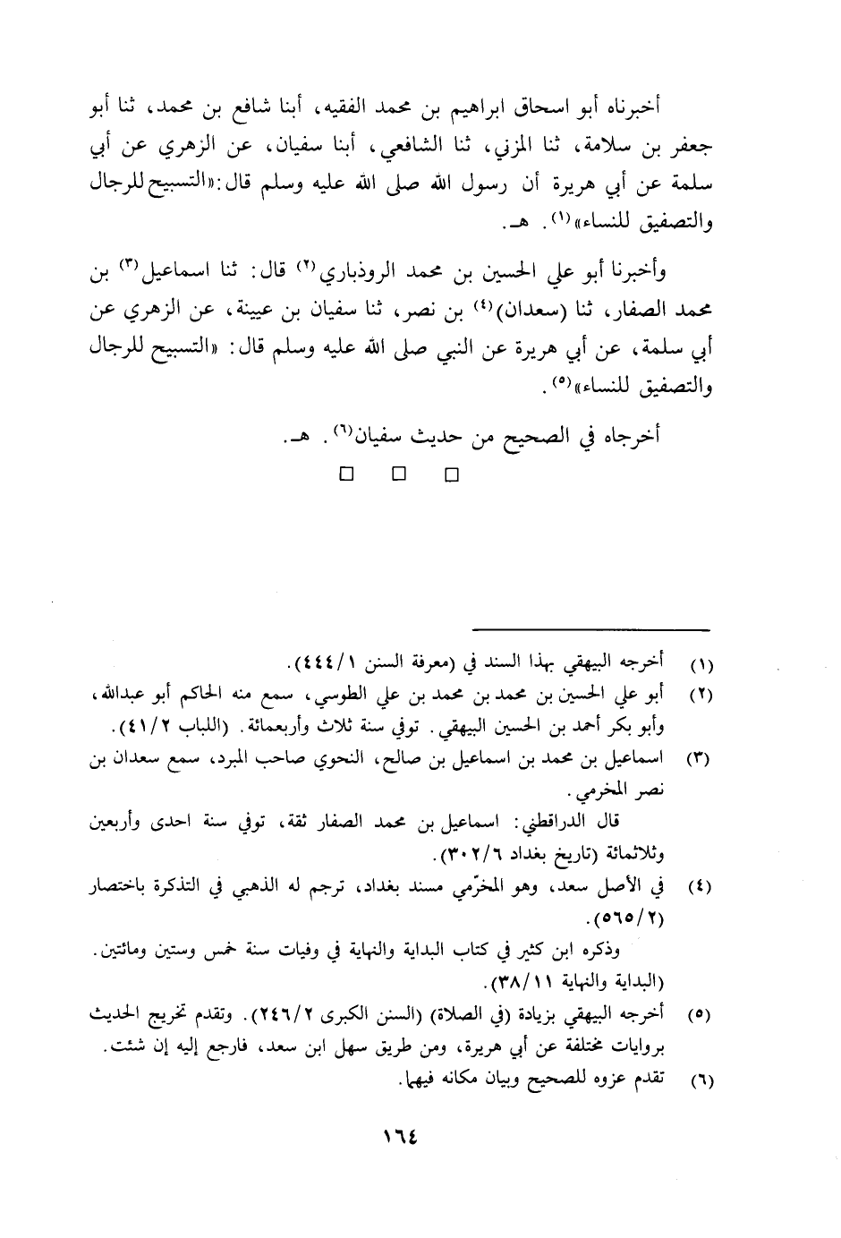 وَأَخْبَرَنَا أَبُو عَلِيٍّ الْحُسَيْنُ بْنُ مُحَمَّدٍ الرُّوذْبَارِيُّ قَالَ: ثنا إِسْمَاعِيلُ بْنُ مُحَمَّدٍ الصَّفَّارُ ثنا سَعْدَانُ بْنُ نَصْرٍ ثنا سُفْيَانُ بْنُ عُيَيْنَةَ عَنِ الزُّهْرِيِّ، عَنْ أَبِي سَلَمَةَ عَنْ أَبِي هُرَيْرَةَ عَنِ النَّبِيِّ صَلَّى اللهُ عَلَيْهِ وَسَلَّمَ قَالَ: «§التَّسْبِيحُ لِلرِّجَالِ، وَالتَّصْفِيقُ لِلنِّسَاءِ» أَخْرَجَاهُ فِي الصَّحِيحِ مِنْ حَدِيثِ سُفْيَانَ