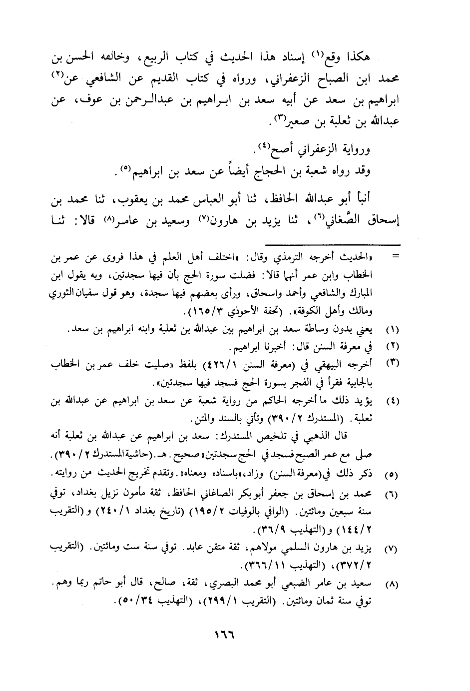 عَنْ سَعْدِ بْنِ إِبْرَاهِيمَ، أنبأ أَبُو عَبْدِ اللَّهِ الْحَافِظُ، ثنا أَبُو الْعَبَّاسِ مُحَمَّدُ بْنُ يَعْقُوبَ، ثنا مُحَمَّدُ بْنُ إِسْحَاقَ الصَّغَانِيُّ، ثنا يَزِيدُ بْنُ هَارُونَ وَسَعِيدُ بْنُ عَامِرٍ، قَالَا: ثنا -[167]- شُعْبَةُ، عَنْ سَعْدِ بْنِ إِبْرَاهِيمَ، عَنْ عَبْدِ اللَّهِ بْنِ ثَعْلَبَةَ: §أَنَّهُ صَلَّى مَعَ عُمَرَ الصُّبْحَ فَسَجَدَ فِي الْحَجِّ سَجْدَتَيْنِ