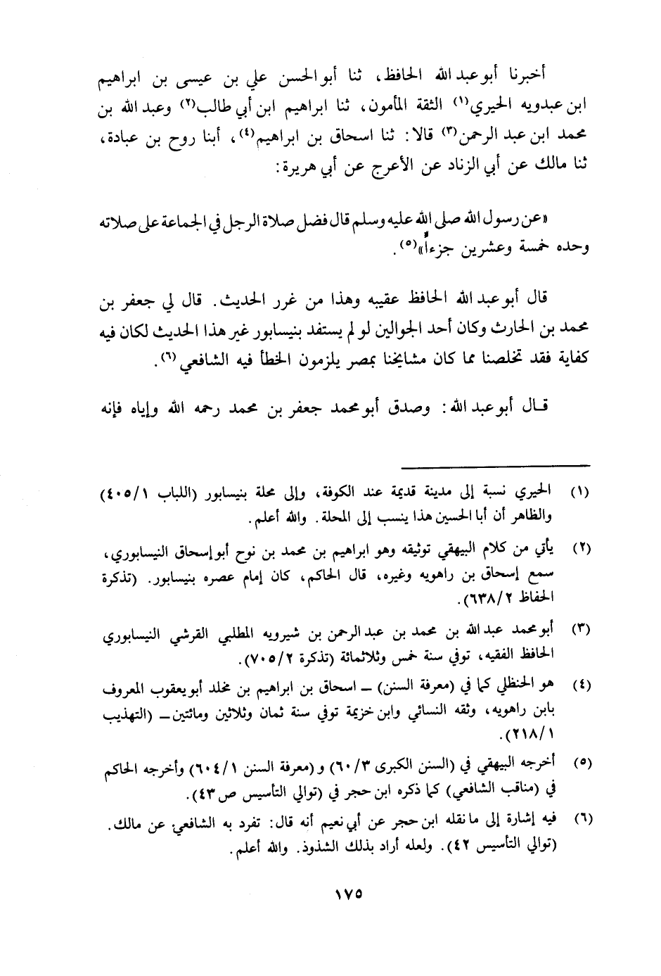 أَخْبَرَنَا أَبُو عَبْدِ اللَّهِ الْحَافِظُ ثنا أَبُو الْحَسَنِ عَلِيُّ بْنُ عِيسَى بْنِ إِبْرَاهِيمَ بْنِ عَبْدُوَيْهِ الْحِيرِيُّ الثِّقَةُ الْمَأْمُونُ، ثنا إِبْرَاهِيمُ بْنُ أَبِي طَالِبٍ وَعَبْدُ اللَّهِ بْنُ مُحَمَّدِ بْنِ عَبْدِ الرَّحْمَنِ قَالَا: ثنا إِسْحَاقُ بْنُ إِبْرَاهِيمَ أبنا رَوْحُ بْنُ عُبَادَةَ ثنا مَالِكٌ عَنْ أَبِي الزِّنَادِ عَنِ الْأَعْرَجِ عَنْ أَبِي هُرَيْرَةَ عَنْ رَسُولِ اللَّهِ صَلَّى اللهُ عَلَيْهِ وَسَلَّمَ، قَالَ: §«فَضْلُ صَلَاةِ الرَّجُلِ فِي الْجَمَاعَةِ عَلَى صَلَاتِهِ وَحْدَهُ خَمْسَةٌ وَعِشْرُونَ جُزْءًا» قَالَ أَبُو عَبْدِ اللَّهِ الْحَافِظُ عَقِيبَهُ، وَهَذَا مِنْ غَرَرِ الْحَدِيثِ. قَالَ لِي جَعْفَرُ بْنُ مُحَمَّدِ بْنِ الْحَارِثِ، وَكَانَ أَحَدَ الْجَوَّالِينَ، لَوْ لَمْ يَسْتَفِدْ بِنَيْسَابُورَ غَيْرَ هَذَا الْحَدِيثِ لَكَانَ فِيهِ كِفَايَةٌ، فَقَدْ تَخَلَّصْنَا مِمَّا كَانَ مَشَايِخُنَا بِمِصْرَ يُلْزِمُونَ الْخَطَأَ فِيهِ الشَّافِعِيَّ. قَالَ أَبُو عَبْدِ اللَّهِ: وَصَدَقَ أَبُو مُحَمَّدٍ جَعْفَرُ بْنُ مُحَمَّدٍ رَحِمَهُ اللَّهُ وَإِيَّاهُ، فَإِنَّهُ -[176]- كَالْأَخْذِ بِالْيَدِ؛ لِأَنَّ إِسْحَاقَ بْنَ رَاهُوَيْهِ إِمَامٌ مُقَدَّمٌ فِي الْحِفْظِ وَالْإِتْقَانِ، وَكَذَلِكَ إِبْرَاهِيمُ بْنُ أَبِي طَالِبٍ حُجَّةٌ وَثَبْتٌ. قَالَ أَحْمَدُ: وَرَوَاهُ أَيْضًا أَبُو عَمْرِو بْنُ حَمْدَانَ، عَنْ عَبْدِ اللَّهِ بْنِ مُحَمَّدِ بْنِ شِيرَوَيْهِ، عَنْ إِسْحَاقَ