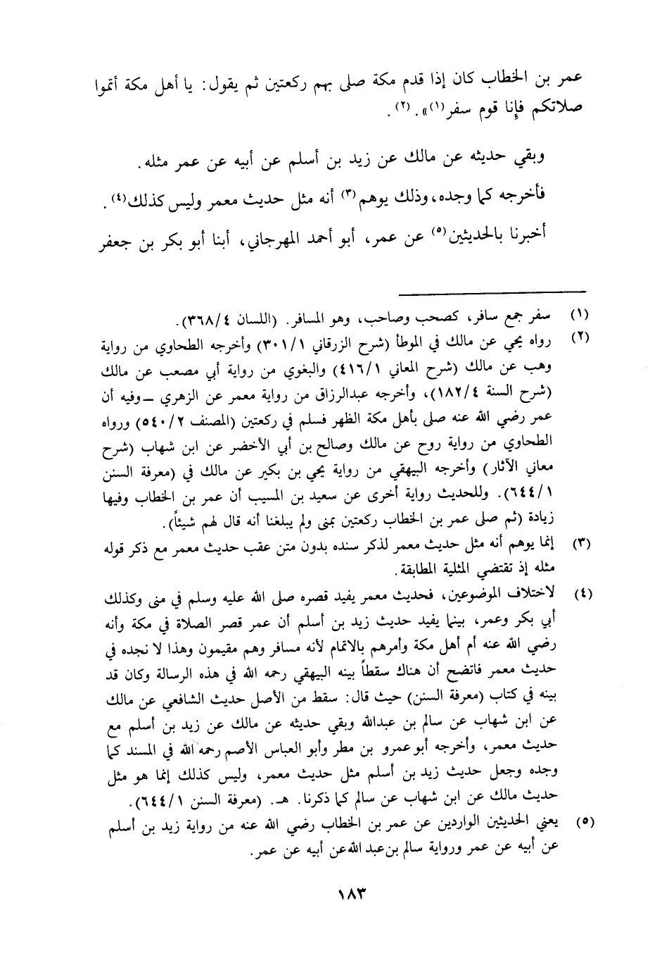 أَخْبَرَنَا بِالْحَدِيثَيْنِ، عَنْ عُمَرَ أَبُو أَحْمَدَ الْمِهْرَجَانِيُّ أبنا أَبُو بَكْرِ بْنُ جَعْفَرٍ -[184]- ثنا مُحَمَّدُ بْنُ إِبْرَاهِيمَ ثنا يَحْيَى بْنُ بُكَيْرٍ ثنا مَالِكٌ عَنِ ابْنِ شِهَابٍ عَنْ سَالِمِ بْنِ عَبْدِ اللَّهِ عَنْ أَبِيهِ: §أَنَّ عُمَرَ بْنَ الْخَطَّابِ، كَانَ إِذَا قَدِمَ مَكَّةَ صَلَّى بِهِمْ رَكْعَتَيْنِ، ثُمَّ يَقُولُ: يَا أَهْلَ مَكَّةَ أَتِمُّوا صَلَاتَكُمْ، فَإِنَّا قَوْمٌ سَفْرٌ وَبِهَذَا الْإِسْنَادِ، قَالَ مَالِكٌ عَنْ زَيْدِ بْنِ أَسْلَمَ عَنْ أَبِيهِ عَنْ عُمَرَ مِثْلَهُ وَالَّذِي يَدُلُّ عَلَى أَنَّ حَدِيثَ مَالِكٍ، عَنِ ابْنِ شِهَابٍ سَقَطَ عَلَى مَنْ دُونَ الشَّافِعِيِّ: أَنَّ الشَّافِعِيَّ قَالَ عَقِيبَ حَدِيثِ مَالِكٍ، عَنْ زَيْدِ بْنِ أَسْلَمَ: وَهَكَذَا أُحِبُّ لِلْإِمَامِ أَنْ يُصَلِّيَ مُسَافِرًا أَوْ مُقِيمًا وَلَا يُوَكِّلَ غَيْرَهُ وَيَأْمُرَ مَنْ وَرَاءَهُ مِنَ الْمُقِيمِينَ أَنْ يُتِمُّوا إِلَّا أَنْ يَكُونُوا قَدْ فَقِهُوا، فَيُكْتَفَى بِفِقْهِهِمْ إِنْ شَاءَ اللَّهُ، وَلَيْسَ هَذَا فِي حَدِيثِ مَعْمَرٍ إِنَّمَا هُوَ فِي حَدِيثِ مَالِكٍ فَلَوْلَا أَنَّهُ ذَكَرَهُ وَإِلَّا لَمْ يُرْدِفْهُ بِهَذَا الْكَلَامِ الَّذِي دَلِيلُهُ فِي حَدِيثِ مَالِكٍ، وَقَدِيمًا قِيلَ فِي النَّوَادِرِ: وَيْلٌ لِلشِّعْرِ مِنْ رِوَايَةِ السُّوءِ " وَهَؤُلَاءِ الرُّوَاةُ وَإِنْ كَانُوا ثِقَاتٍ فَكَانَ يَنْبَغِي لَهُمْ أَنْ يُرَاعُوا هَذِهِ الرِّوَايَاتِ أَكْثَرَ مِمَّا رَعَوْهَا حَتَّى لَا يَقَعَ فِيهَا مَا وَقَعَ، وَلَا يُحْتَاجَ إِلَى هَذَا الْبَيَانِ، وَقَدْ نَزَّهَ اللَّهُ عَزَّ وَجَلَّ الْمُطَّلِبِيَّ عَنْ جَمِيعِ ذَلِكَ بِحَمْدِ اللَّهِ وَمَنِّهِ