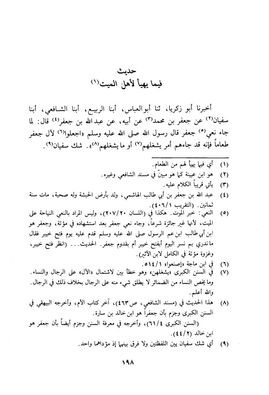 أَخْبَرَنَا أَبُو زَكَرِيَّا ثنا أَبُو الْعَبَّاسِ أبنا الرَّبِيعُ أبنا الشَّافِعِيُّ أبنا سُفْيَانُ، عَنْ جَعْفَرِ بْنِ مُحَمَّدٍ عَنْ أَبِيهِ عَنْ عَبْدِ اللَّهِ بْنِ جَعْفَرٍ قَالَ: لَمَّا جَاءَ نَعْيُ جَعْفَرٍ، قَالَ رَسُولُ اللَّهِ صَلَّى اللهُ عَلَيْهِ وَسَلَّمَ: §«اجْعَلُوا لِآلِ جَعْفَرٍ طَعَامًا فَإِنَّهُ قَدْ جَاءَهُمْ أَمْرٌ يَشْغَلُهُمْ أَوْ» مَا يَشْغَلُهُمْ " شَكَّ سُفْيَانُ -[199]- هَكَذَا وُجِدَ هَذَا الْحَدِيثُ فِي كِتَابِ الْأَصَمِّ، وَهُوَ خَطَأٌ، وَقَدْ رَوَاهُ غَيْرُهُ عَنِ الرَّبِيعِ، عَنِ الشَّافِعِيِّ، عَنْ سُفْيَانَ، عَنْ جَعْفَرِ بْنِ خَالِدٍ، عَنْ أَبِيهِ، عَنْ عَبْدِ اللَّهِ بْنِ جَعْفَرٍ، وَهُوَ الصَّحِيحُ. كَذَلِكَ رَوَاهُ الْحُمَيْدِيُّ وَغَيْرُهُ عَنْ سُفْيَانَ، وَهُوَ جَعْفَرُ بْنُ خَالِدِ بْنِ سَارَةَ الْمَخْزُومِيُّ