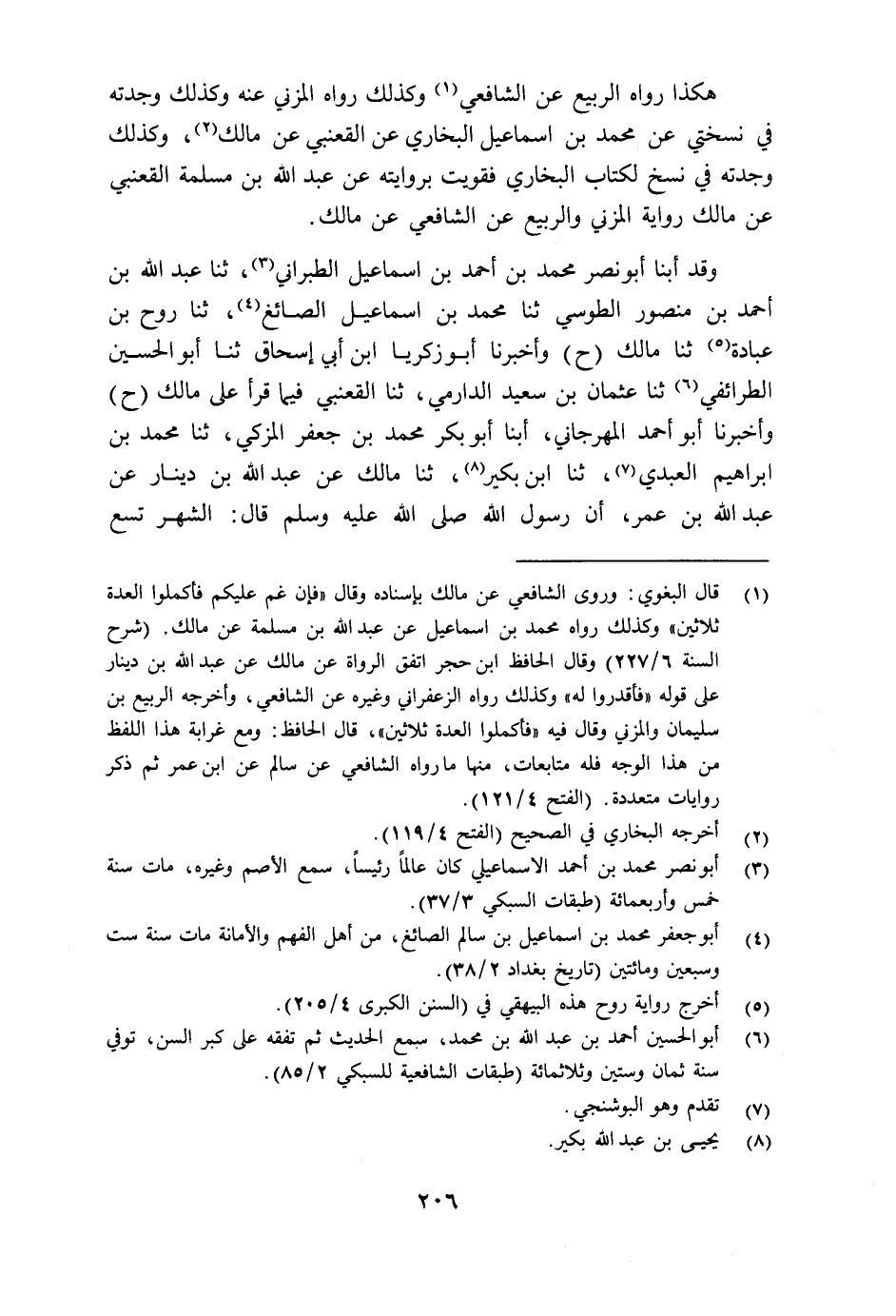 وَقَدْ أبنا أَبُو نَصْرٍ مُحَمَّدُ بْنُ أَحْمَدَ بْنِ إِسْمَاعِيلَ الطَّبَرَانِيُّ، ثنا عَبْدُ اللَّهِ بْنُ أَحْمَدَ بْنِ مَنْصُورٍ الطُّوسِيُّ ثنا مُحَمَّدُ بْنُ إِسْمَاعِيلَ الصَّائِغُ ثنا رَوْحُ بْنُ عُبَادَةَ ثنا مَالِكٌ، ح وَأَخْبَرَنَا أَبُو زَكَرِيَّا بْنُ أَبِي إِسْحَاقَ ثنا أَبُو الْحُسَيْنِ الطَّرَائِفِيُّ ثنا عُثْمَانُ بْنُ سَعِيدٍ الدَّارِمِيُّ، ثنا الْقَعْنَبِيُّ فِيمَا قَرَأَ عَلَى مَالِكٍ ح وَأَخْبَرَنَا أَبُو أَحْمَدَ الْمِهْرَجَانِيُّ أبنا أَبُو بَكْرٍ مُحَمَّدُ بْنُ جَعْفَرٍ الْمُزَكِّي، ثنا مُحَمَّدُ بْنُ إِبْرَاهِيمَ الْعَبْدِيُّ ثنا ابْنُ بُكَيْرٍ ثنا مَالِكٌ عَنْ عَبْدِ اللَّهِ بْنِ دِينَارٍ عَنْ عَبْدِ اللَّهِ بْنِ عُمَرَ، أَنَّ رَسُولَ اللَّهِ صَلَّى اللهُ عَلَيْهِ وَسَلَّمَ قَالَ: «§الشَّهْرُ تِسْعٌ -[207]- وَعِشْرُونَ فَلَا تَصُومُوا حَتَّى تَرَوُا الْهِلَالَ، وَلَا تُفْطِرُوا حَتَّى تَرَوْهُ، فَإِنْ غُمَّ عَلَيْكُمْ فَاقْدُرُوا لَهُ» وَهَكَذَا رَوَاهُ مَعْنُ بْنُ عِيسَى وَعَبْدُ اللَّهِ بْنُ نَافِعٍ وَأَبُو مُصْعَبٍ، عَنْ مَالِكٍ، فَإِنْ كَانَ قَوْلُهُ: فَأَكْمِلُوا الْعِدَّةَ ثَلَاثِينَ، مَحْفُوظًا فَيُشْبِهُ أَنْ يَكُونَ مَالِكٌ رَوَاهُ عَلَى اللَّفْظَيْنِ جَمِيعًا، إِلَّا أَنَّ أَكْثَرَ الرُّوَاةِ عَنْ مَالِكٍ عَلَى اللَّفْظَةِ الْأَخِيرَةِ -[208]-، وَوَافَقَ إِسْمَاعِيلُ بْنُ جَعْفَرٍ مَالِكًا عَلَى رِوَايَتِهِ، عَنْ عَبْدِ اللَّهِ بْنِ دِينَارٍ عَلَى اللَّفْظَةِ الْأَخِيرَةِ