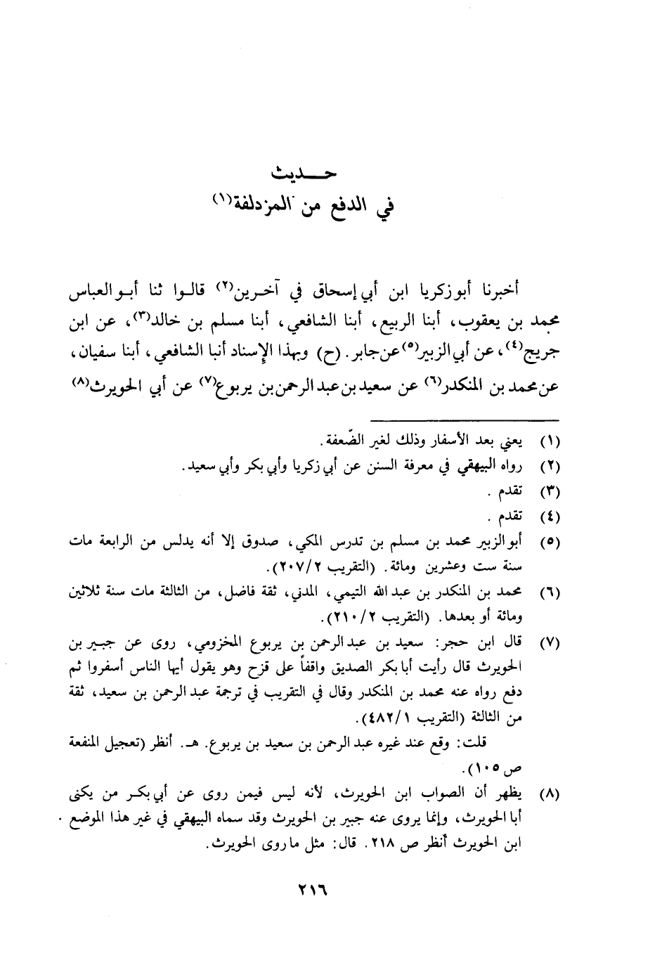 أَخْبَرَنَا أَبُو زَكَرِيَّا بْنُ أَبِي إِسْحَاقَ، فِي آخَرِينَ، قَالُوا: ثنا أَبُو الْعَبَّاسِ مُحَمَّدُ بْنُ يَعْقُوبَ، أبنا الرَّبِيعُ أبنا الشَّافِعِيُّ أبنا مُسْلِمُ بْنُ خَالِدٍ عَنِ ابْنِ جُرَيْجٍ عَنْ أَبِي الزُّبَيْرِ عَنْ جَابِرٍ، ح وَبِهَذَا الْإِسْنَادِ أنبا الشَّافِعِيُّ أبنا سُفْيَانُ، عَنْ مُحَمَّدِ بْنِ الْمُنْكَدِرِ عَنْ سَعِيدِ بْنِ عَبْدِ الرَّحْمَنِ بْنِ يَرْبُوعٍ عَنْ أَبِي الْحُوَيْرِثِ -[217]-،. وَفِي مَوْضِعٍ آخَرَ عَنْ جُوَيْبِرِ بْنِ حُوَيْرِثٍ، قَالَ: رَأَيْتُ أَبَا بَكْرٍ الصِّدِّيقَ رَضِيَ اللَّهُ عَنْهُ §وَاقِفًا عَلَى قُزَحٍ وَهُوَ يَقُولُ: أَيُّهَا النَّاسُ أَصْبِحُوا، أَيُّهَا النَّاسُ، وَقَالَ فِي مَوْضِعٍ آخَرَ: أَيُّهَا النَّاسُ أَسْفِرُوا، ثُمَّ دَفَعَ فَكَأَنِّي أَنْظُرُ إِلَى فَخِذِهِ مِمَّا خَرَشَ بَعِيرَهُ بِمِحْجَنِهِ -[218]- هَكَذَا وَجَدْتُ الْحَدِيثَ فِي مُخْتَصَرِ الْحَجِّ الْكَبِيرِ. وَذَلِكَ يُوهِمُ أَنْ يَكُونَ جَابِرٌ رَوَى عَنْ أَبِي بَكْرٍ رَضِيَ اللَّهُ عَنْهُ مِثْلَ مَا رَوَى ابْنُ الْحُوَيْرِثِ وَعِنْدِي أَنَّهُ ذَكَرَ إِسْنَادَ حَدِيثِ جَابِرٍ، ثُمَّ لَعَلَّهُ شَكَّ فِي شَيْءٍ مِنْ مَتْنِهِ فَتَرَكَهُ وَتَرَكَ الْبَيَاضَ، وَصَارَ إِلَى حَدِيثِ أَبِي بَكْرٍ رَضِيَ اللَّهُ عَنْهُ لِيَرْجِعَ إِلَى كِتَابِهِ فَلَمْ يَقْدِرْ، فَتَوَهَّمَ الْكَاتِبُ أَنَّهُ إِسْنَادٌ فَكَتَبَهَا، وَهُوَ خَطَأٌ إِنَّمَا أَرَادَ بِحَدِيثِ جَابِرٍ مَتْنًا آخَرَ