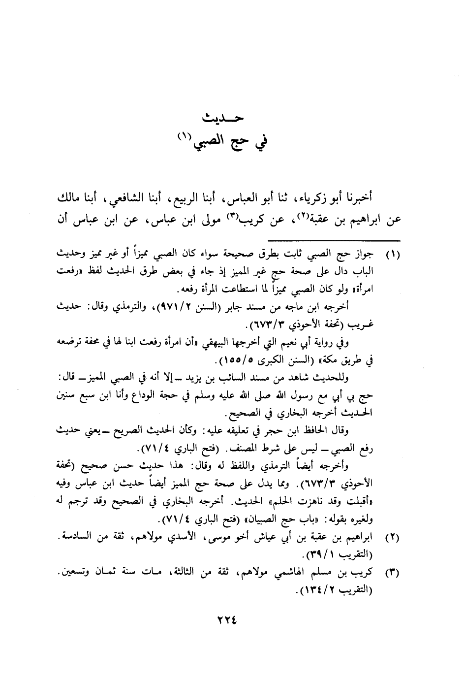 أَخْبَرَنَا أَبُو زَكَرِيَّا ثنا أَبُو الْعَبَّاسِ أبنا الرَّبِيعُ أبنا الشَّافِعِيُّ أبنا، مَالِكُ عَنْ إِبْرَاهِيمَ بْنِ عُقْبَةَ عَنْ كُرَيْبٍ، مَوْلَى ابْنِ عَبَّاسٍ، عَنِ ابْنِ عَبَّاسٍ: أَنَّ رَسُولَ اللَّهِ صَلَّى اللهُ عَلَيْهِ وَسَلَّمَ -[225]- مَرَّ بِامْرَأَةٍ وَهِيَ فِي مِحَفَّتِهَا، فَقِيلَ لَهَا: هَذَا رَسُولُ اللَّهِ صَلَّى اللهُ عَلَيْهِ وَسَلَّمَ، فَأَخَذَتْ بِعَضُدِ صَبِيٍّ كَانَ مَعَهَا، فَقَالَتْ: أَلِهَذَا حَجٌّ؟ فَقَالَ: «§نَعَمْ، وَلَكِ أَجْرٌ» هَكَذَا رَوَاهُ الرَّبِيعُ بْنُ سُلَيْمَانَ، عَنِ الشَّافِعِيِّ فِي كِتَابِ الْمَنَاسِكِ مَوْصُولًا، وَرَوَاهُ فِي مَوْضِعٍ آخَرَ مِنَ الْمَنَاسِكِ مُرْسَلًا دُونَ ذِكْرِ ابْنِ عَبَّاسٍ فِيهِ، وَكَذَلِكَ رَوَاهُ الْحَسَنُ بْنُ مُحَمَّدِ بْنِ الصَّبَّاحِ الزَّعْفَرَانِيُّ، عَنِ الشَّافِعِيِّ فِي الْكِتَابِ الْقَدِيمِ مُرْسَلًا، وَكَذَلِكَ رَوَاهُ أَكْثَرُ أَصْحَابِ الْمُوَطَّأِ، عَنْ مَالِكٍ مُرْسَلًا -[226]-. وَرُوِيَ عَنْ أَبِي مُصْعَبٍ، عَنْ مَالِكٍ مَوْصُولًا، أَخْبَرَنَاهُ أَبُو الْحَسَنِ عَلِيُّ بْنُ أَحْمَدَ بْنِ عَبْدَانَ، أبنا أَحْمَدُ بْنُ عُبَيْدٍ الصَّفَّارُ، ثنا إِسْمَاعِيلُ بْنُ الْفَضْلِ، ثنا أَبُو مُصْعَبٍ، عَنْ مَالِكٍ، عَنْ إِبْرَاهِيمَ بْنِ عُقْبَةَ، عَنْ كُرَيْبٍ مَوْلَى ابْنِ عَبَّاسٍ، عَنِ ابْنِ عَبَّاسٍ: أَنَّ رَسُولَ اللَّهِ صَلَّى اللهُ عَلَيْهِ وَسَلَّمَ مَرَّ بِامْرَأَةٍ وَهِيَ فِي مِحَفَّتِهَا، فَقِيلَ لَهَا هَذَا رَسُولُ اللَّهِ صَلَّى اللهُ عَلَيْهِ وَسَلَّمَ فَأَخَذَتْ بِعَضُدِ صَبِيٍّ كَانَ مَعَهَا فَقَالَتْ: أَلِهَذَا حَجٌّ؟ فَقَالَ رَسُولُ اللَّهِ صَلَّى اللهُ عَلَيْهِ وَسَلَّمَ: «نَعَمْ وَلَكِ أَجْرٌ» هَكَذَا وَجَدْتُهُ فِي الْمُسْنَدِ مَوْصُولًا. وَكَذَلِكَ رَوَاهُ إِبْرَاهِيمُ بْنُ عَبْدِ الصَّمَدِ الْهَاشِمِيُّ وَأَبُو مُحَمَّدٍ حَامِدُ بْنُ سَهْلِ بْنِ الْحَارِثِ، عَنْ أَبِي مُصْعَبٍ عَنْ مَالِكٍ فِي الْمُوَطَّأِ مَوْصُولًا، وَيُشْبِهُ أَنْ يَكُونَ مَالِكٌ يُوصِلُهُ مَرَّةً وَيُرْسِلُهُ أُخْرَى، فَاخْتَلَفَ الرُّوَاةُ عَنْهُ لِذَلِكَ، وَاللَّهُ أَعْلَمُ -[227]-. وَالْحَدِيثُ فِي الْأَصْلِ مَوْصُولٌ مِنْ غَيْرِ جِهَةِ مَالِكٍ، رَوَاهُ الشَّافِعِيُّ، وَجَمَاعَةٌ، عَنْ سُفْيَانَ بْنِ عُيَيْنَةَ، عَنْ إِبْرَاهِيمَ بْنِ عُقْبَةَ مَوْصُولًا وَأَخْرَجَهُ مُسْلِمٌ فِي الصَّحِيحِ، عَنْ أَبِي بَكْرِ بْنِ أَبِي شَيْبَةَ وَغَيْرِهِ، عَنْ سُفْيَانَ، ورُوِّينَاهُ مِنْ حَدِيثِ إِسْمَاعِيلَ بْنِ إِبْرَاهِيمَ بْنِ عُقْبَةَ، وَعَبْدِ الْعَزِيزِ بْنِ أَبِي سَلَمَةَ، عَنْ إِبْرَاهِيمَ بْنِ عُقْبَةَ مَوْصُولًا. وَاخْتُلِفَ فِيهِ عَلَى سُفْيَانَ الثَّوْرِيِّ، عَنْ إِبْرَاهِيمَ، فَرَوَاهُ عَنْهُ يَحْيَى بْنُ سَعِيدٍ، وَعَبْدُ الرَّحْمَنِ بْنُ مَهْدِيٍّ مُرْسَلًا، وَرَوَاهُ عَنْهُ أَبُو نُعَيْمٍ مَوْصُولًا -[228]-. وَرَوَاهُ جَمَاعَةٌ، عَنْ سُفْيَانَ الثَّوْرِيِّ، عَنْ مُحَمَّدِ بْنِ عُقْبَةَ، عَنْ كُرَيْبٍ، عَنِ ابْنِ عَبَّاسٍ مَوْصُولًا، وَأَخْرَجَهُ مُسْلِمٌ فِي الصَّحِيحِ مِنْ حَدِيثِ عَبْدِ الرَّحْمَنِ بْنِ مَهْدِيٍّ، وَأَبِي أُسَامَةَ، عَنْ سُفْيَانَ، عَنْ مُحَمَّدِ بْنِ عُقْبَةَ مَوْصُولًا، وَمِنْ حَدِيثِ ابْنِ مَهْدِيٍّ، عَنْ سُفْيَانَ، عَنْ إِبْرَاهِيمَ مُرْسَلًا، فَأَمَّا مِنْ جِهَةِ مَالِكٍ، عَنْ إِبْرَاهِيمَ فَالَّذِي يَغْلِبُ عَلَى الظَّنِّ أَنَّهُ وَقَعَ فِي أَحَدِ الْمَوْضِعَيْنِ فِي كِتَابِ الرَّبِيعِ خَطَأً مِنَ الْكَاتِبِ بِدَلِيلِ رِوَايَتِهِ فِي مَوْضِعٍ آخَرَ مُرْسَلًا، وَرِوَايَةُ الزَّعْفَرَانِيِّ عَنْهُ فِي الْكِتَابِ الْقَدِيمِ مُرْسَلًا، وَاللَّهُ أ