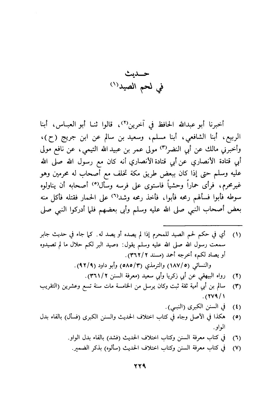 أَخْبَرَنَا أَبُو عَبْدِ اللَّهِ الْحَافِظُ، فِي آخَرِينَ، قَالُوا: ثنا أَبُو الْعَبَّاسِ أبنا الرَّبِيعُ أبنا الشَّافِعِيُّ أبنا مُسْلِمٌ، وَسَعِيدُ بْنُ سَالِمٍ عَنِ ابْنِ جُرَيْجٍ، ح وَأَخْبَرَنِي مَالِكٌ عَنْ أَبِي النَّضْرِ، مَوْلَى عُمَرَ بْنِ عُبَيْدِ اللَّهِ التَّيْمِيِّ، عَنْ نَافِعٍ، مَوْلَى أَبِي قَتَادَةَ الْأَنْصَارِيِّ عَنْ أَبِي قَتَادَةَ الْأَنْصَارِيِّ، أَنَّهُ كَانَ مَعَ رَسُولِ اللَّهِ صَلَّى اللهُ عَلَيْهِ وَسَلَّمَ حَتَّى إِذَا كَانَ بِبَعْضِ طَرِيقِ مَكَّةَ تَخَلَّفَ مَعَ أَصْحَابٍ لَهُ مُحْرِمِينَ وَهُوَ غَيْرُ مُحْرِمٍ فَرَأَى حِمَارًا وَحْشِيًّا فَاسْتَوَى عَلَى فَرَسِهِ وَسَأَلَ أَصْحَابَهُ أَنْ يُنَاوِلُوهُ سَوْطَهُ فَأَبَوْا، فَسَأَلَهُمْ رُمْحَهُ فَأَبَوْا، فَأَخَذَ رُمْحَهُ، وَشَدَّ عَلَى الْحِمَارِ فَقَتَلَهُ، فَأَكَلَ مِنْهُ بَعْضُ أَصْحَابِ النَّبِيِّ صَلَّى اللهُ عَلَيْهِ وَسَلَّمَ وَأَبَى بَعْضُهُمْ، فَلَمَّا أَدْرَكُوا النَّبِيَّ صَلَّى اللهُ عَلَيْهِ وَسَلَّمَ -[230]- فَسَأَلُوا عَنْ ذَلِكَ فَقَالَ: §«إِنَّمَا هِيَ طُعْمَةٌ أَطْعَمَكُمُوهَا اللَّهُ عَزَّ وَجَلَّ» هَكَذَا وَجَدْنَا هَذَا الْحَدِيثَ فِي كِتَابِ اخْتِلَافِ الْأَحَادِيثِ، وَالَّذِي نَقَلَهُ إِلَى الْمُسْنَدِ تَوَهَّمَ أَنَّ الْإِسْنَادَ الْأَوَّلَ مَضْمُومٌ إِلَى الثَّانِي فِي حَدِيثِ أَبِي قَتَادَةَ وَلَيْسَ كَذَلِكَ، فَإِنَّ الْإِسْنَادَ الْأَوَّلَ إِنَّمَا هُوَ لِحَدِيثِ ابْنِ جُرَيْجٍ، عَنْ مُحَمَّدِ بْنِ الْمُنْكَدِرِ، عَنْ مُعَاذِ بْنِ عَبْدِ الرَّحْمَنِ، يَعْنِي ابْنَ عُثْمَانَ التَّيْمِيَّ، عَنْ أَبِيهِ، قَالَ: كُنَّا مَعَ طَلْحَةَ بْنِ عُبَيْدِ اللَّهِ فِي طَرِيقِ مَكَّةَ وَنَحْنُ مُحْرِمُونَ، فَأَهْدَوْا لَنَا لَحْمَ صَيْدٍ وَطَلْحَةُ رَاقِدٌ فَمِنَّا مَنْ أَكَلَ، وَمِنَّا مَنْ تَوَرَّعَ فَلَمْ يَأْكُلْ، فَلَمَّا اسْتَيْقَظَ، قَالَ لِلَّذِينَ أَكَلُوا: أَصَبْتُمْ، وَقَالَ لِلَّذِينَ لَمْ يَأْكُلُوا: أَخْطَأْتُمْ، فَإِنَّا قَدْ أَكَلْنَا مَعَ النَّبِيِّ صَلَّى اللهُ عَلَيْهِ وَسَلَّمَ -[231]- وَنَحْنُ حُرُمٌ وَفِي رِوَايَةٍ أُخْرَى، فَلَمَّا اسْتَيْقَظَ أَخْبَرُوهُ فَوَفَّقَ مَنْ أَكَلَهُ، وَقَالَ: أَكَلْنَاهُ مَعَ النَّبِيِّ صَلَّى اللهُ عَلَيْهِ وَسَلَّمَ أبنا أَبُو أَحْمَدَ عَبْدُ اللَّهِ بْنُ مُحَمَّدِ بْنِ الْحَسَنِ الْمِهْرَجَانَيُّ ثنا أَبُو عَبْدِ اللَّهِ مُحَمَّدُ بْنُ يَعْقُوبَ ثنا إِبْرَاهِيمُ بْنُ عَبْدِ اللَّهِ أبنا أَبُو عَاصِمٍ عَنِ ابْنِ جُرَيْجٍ، ح، وأبنا أَبُو عَبْدِ اللَّهِ الْحَافِظُ أبنا أَبُو الْحُسَيْنِ، مُحَمَّدُ بْنُ أَحْمَدَ بْنِ تَمِيمٍ الْقَنْطَرِيُّ. ثنا أَبُو قِلَابَةَ ثنا أَبُو عَاصِمٍ عَنِ ابْنِ جُرَيْجٍ وأبنا أَبُو عَبْدِ اللَّهِ أبنا مُحَمَّدُ بْنُ عَلِيِّ بْنِ دُحَيْمٍ ثنا أَحْمَدُ بْنُ خَازِمِ بْنِ أَبِي غَرَزَةَ ثنا أَبُو بَكْرِ بْنُ أَبِي شَيْبَةَ ثنا يَحْيَى بْنُ سَعِيدٍ عَنِ ابْنِ جُرَيْجٍ فَذَكَرَاهُ -[232]-. وَرَوَاهُ مُسْلِمٌ فِي الصَّحِيحِ عَنْ زُهَيْرِ بْنِ حَرْبٍ عَنْ يَحْيَى بْنِ سَعِيدٍ، وَظَاهِرٌ فِي كَلَامِ الشَّافِعِيِّ بَعْدَ هَذَا الْحَدِيثِ أَنَّهُ أَرَادَ بِحَدِيثِ ابْنِ جُرَيْجٍ حَدِيثَ طَلْحَةَ، وَلَكِنَّهُ حِينَ كَانَ بِمِصْرَ فِي آخِرِ عُمْرِهِ كَانَ أَكْثَرُ كُتُبِهِ غَائِبًا عَنْهُ، فَرُبَّمَا كَانَ يَكْتُبُ مِنْ إِسْنَادِ حَدِيثٍ بَعْضَهُ وَيَتْرُكُ الْبَيَاضَ، أَوْ يَكْتُبُهُ كُلُّهُ دُونَ مَتْنِهِ، وَيَدَعُ الْبَيَاضَ لِيُتِّمَهُ عَلَى الْيَقِينِ إِذَا رَجَعَ إِلَى كِتَابِهِ، وَيَكْتُبُ بَعْدَهُ حَدِيثًا آخَرَ لَا يَشُكُّ فِيهِ، فَأَدْرَكْتُهُ الْمَنِيَّةُ قَبْلَ إِتْمَامِهِ، فَتَ
