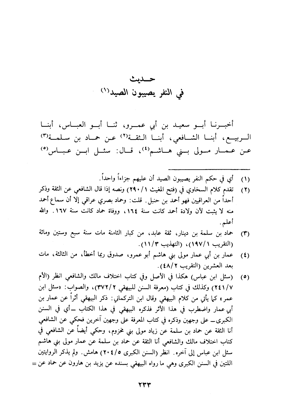 أَخْبَرَنَا أَبُو سَعِيدِ بْنُ أَبِي عَمْرٍو ثنا أَبُو الْعَبَّاسِ أبنا الرَّبِيعُ أبنا الشَّافِعِيُّ أبنا الثِّقَةُ عَنْ حَمَّادِ بْنِ سَلَمَةَ عَنْ عَمَّارٍ، مَوْلَى بَنِي هَاشِمٍ، قَالَ: سُئِلَ ابْنُ عَبَّاسٍ -[234]- عَنْ نَفَرٍ أَصَابُوا صَيْدًا: قَالَ: عَلَيْهِمْ جَزَاءٌ، قِيلَ: عَلَى كُلِّ وَاحِدٍ مِنْهُمْ جَزَاءٌ؟ قَالَ: §إِنَّهُ لَمُعَزَّزٌ بِكُمْ، فَلَكُمْ جَزَاءٌ وَاحِدٌ كَذَا وَجَدْتُ هَذَا الْحَدِيثَ فِي كِتَابِ اخْتِلَافِ مَالِكٍ وَالشَّافِعِيِّ، قَالَ: سُئِلَ -[235]- ابْنُ عَبَّاسٍ وَهُوَ خَطَأٌ مِنَ الْكَاتِبِ إِنَّمَا هُوَ عَنِ ابْنِ عُمَرَ، وَفِي كَلَامِ الشَّافِعِيِّ عَلَى الْخَبَرِ دَلَالَةٌ عَلَى أَنَّهُ عَنِ ابْنِ عُمَرَ، وَأَنَّ الْغَلَطَ وَقَعَ مِنَ الْكَاتِبِ