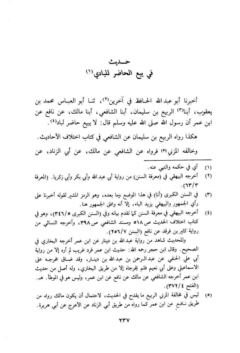 أَخْبَرَنَا أَبُو عَبْدِ اللَّهِ الْحَافِظُ، فِي آخَرِينَ، ثنا أَبُو الْعَبَّاسِ مُحَمَّدُ بْنُ يَعْقُوبَ، أبنا الرَّبِيعُ بْنُ سُلَيْمَانَ أبنا الشَّافِعِيُّ أبنا مَالِكٌ عَنْ نَافِعٍ عَنِ ابْنِ عُمَرَ: أَنَّ رَسُولَ اللَّهِ صَلَّى اللهُ عَلَيْهِ وَسَلَّمَ قَالَ: §«لَا يَبِيعُ حَاضِرٌ لِبَادٍ» هَكَذَا رَوَاهُ الرَّبِيعُ بْنُ سُلَيْمَانَ، عَنِ الشَّافِعِيِّ فِي كِتَابِ اخْتِلَافِ الْأَحَادِيثِ