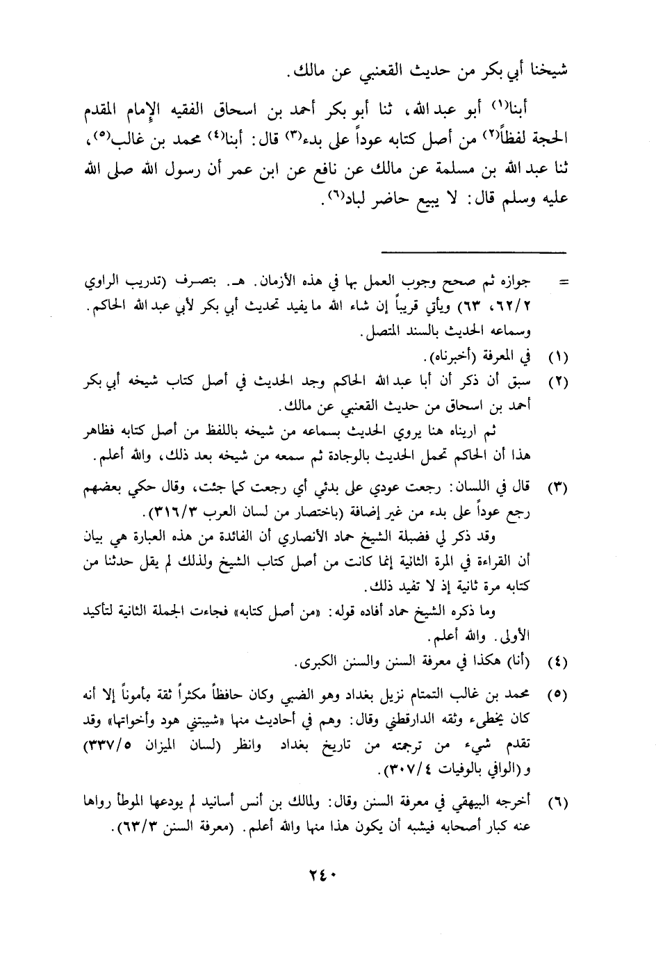 عَنِ مَالِكٍ أبنا أَبُو عَبْدِ اللَّهِ، ثنا أَبُو بَكْرٍ أَحْمَدُ بْنُ إِسْحَاقَ الْفَقِيهُ الْإِمَامُ الْمُقَدَّمُ الْحُجَّةُ لَفْظًا مِنْ أَصْلِ كِتَابِهِ عَوْدًا عَلَى بَدْءٍ، قَالَ: أبنا مُحَمَّدُ بْنُ غَالِبٍ، ثنا عَبْدُ اللَّهِ بْنُ مَسْلَمَةَ، عَنْ مَالِكٍ، عَنْ نَافِعِ، عَنِ ابْنِ عُمَرَ: أَنَّ رَسُولَ اللَّهِ صَلَّى اللهُ عَلَيْهِ وَسَلَّمَ قَالَ: §«لَا يَبِيعُ حَاضِرٌ لِبَادٍ» -[241]- أبنا أَبُو عَبْدِ اللَّهِ قَالَ: سَأَلْتُ أَبَا الْحَسَنِ عَلِيَّ بْنَ عُمَرَ بْنِ مَهْدِيٍّ الْحَافِظَ عَنْ مُحَمَّدِ بْنِ غَالِبٍ، فَكَتَبَ بِخَطِّهِ تَحْتَ اسْمِ مُحَمَّدِ بْنِ غَالِبٍ: ثِقَةٌ ثِقَةٌ وثنا أَبُو بَكْرٍ مُحَمَّدُ بْنُ إِبْرَاهِيمَ الْأَرْدَسْتَانِيُّ الْحَافِظُ، أَخْبَرَنِي الْقَاضِي أَبُو نَصْرٍ شُعَيْبُ بْنُ عَلِيٍّ الْهَمْدَانِيُّ بِهَا، أبنا عَبْدُ الرَّحْمَنِ بْنُ مُحَمَّدٍ ثنا إِبْرَاهِيمُ بْنُ نَصْرٍ، ثنا عَبْدُ اللَّهِ بْنُ مَسْلَمَةَ الْقَعْنَبِيُّ، فَذَكَرَهُ، وَلِابْنِ عُمَرَ فِي هَذَا الْأَصْلِ مِنْ غَيْرِ هَذَا الْوَجْهِ. فَقَدْ رَوَاهُ عَبْدُ الرَّحْمَنِ بْنُ عَبْدِ اللَّهِ بْنِ دِينَارٍ، عَنْ أَبِيهِ، عَنِ ابْنِ عُمَرَ
