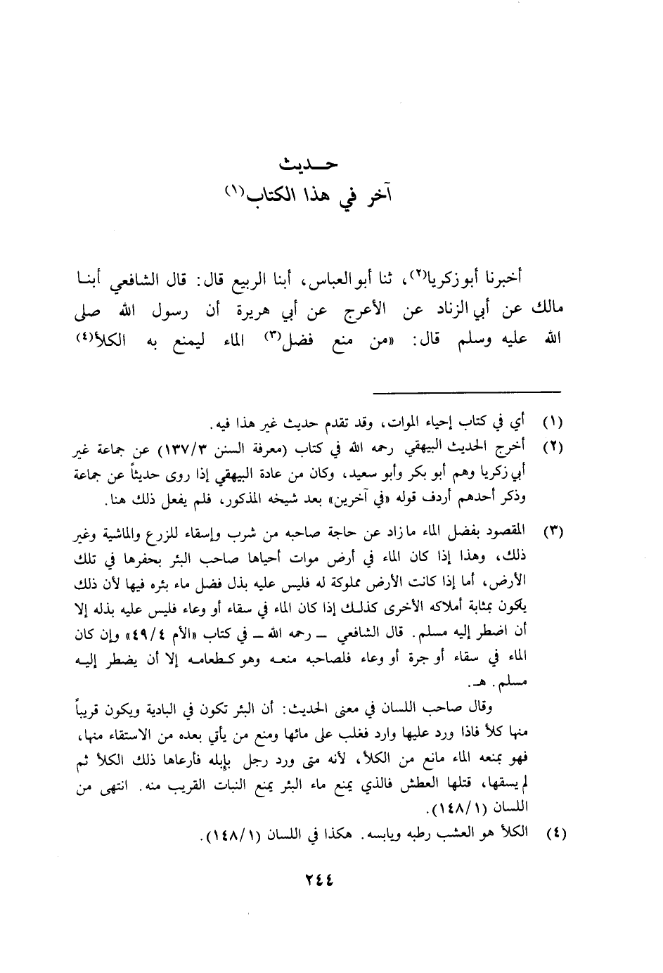 أَخْبَرَنَا أَبُو زَكَرِيَّا ثنا أَبُو الْعَبَّاسِ أبنا الرَّبِيعُ قَالَ: قَالَ الشَّافِعِيُّ: أبنا مَالِكٌ عَنْ أَبِي الزِّنَادِ عَنِ الْأَعْرَجِ عَنْ أَبِي هُرَيْرَةَ: أَنَّ رَسُولَ اللَّهِ صَلَّى اللهُ عَلَيْهِ وَسَلَّمَ قَالَ: §«مَنْ مَنَعَ فَضْلَ الْمَاءِ لِيَمْنَعَ بِهِ الْكَلَأَ -[245]- مَنَعَهُ اللَّهُ فَضْلَ رَحْمَتِهِ يَوْمَ الْقِيَامَةِ» هَكَذَا وَقَعَ هَذَا الْحَدِيثُ بِهَذَا اللَّفْظِ، وَهُوَ خَطَأٌ مِنَ الْكَاتِبِ، وَهَذَا الْكِتَابُ مِمَّا لَمْ يُقْرَأْ عَلَى الشَّافِعِيِّ وَلَمْ يَسْمَعْهُ مِنْهُ الرَّبِيعُ، وَلَوْ قُرِئَ عَلَيْهِ لَغَيَّرَهُ إِنْ -[246]- شَاءَ اللَّهُ، فَإِنَّ هَذَا الْحَدِيثَ بِهَذَا اللَّفْظِ إِنَّمَا يُرْوَى عَنْ عَمْرِو بْنِ شُعَيْبٍ، عَنْ أَبِيهِ، عَنْ جَدِّهِ، عَنِ النَّبِيِّ صَلَّى اللهُ عَلَيْهِ وَسَلَّمَ، وَمِنْ وَجْهٍ آخَرَ ضَعِيفٍ عَنْ أَبِي هُرَيْرَةَ، وَمِنْ حَدِيثِ الْحَسَنِ، عَنِ النَّبِيِّ صَلَّى اللهُ عَلَيْهِ وَسَلَّمَ -[247]-، وَمَعْنَاهُ مَوْجُودٌ فِي الْحَدِيثِ الصَّحِيحِ عَنْ أَبِي صَالِحٍ عَنْ أَبِي هُرَيْرَةَ. فَأَمَّا حَدِيثُ مَالِكٍ، عَنْ أَبِي الزِّنَادِ فَإِنَّهُ إِنَّمَا يُعْرَفُ بِاللَّفْظِ الَّذِي رَوَاهُ الشَّافِعِيُّ فِي الْقَدِيمِ، وَرَوَاهُ عَنْهُ الزَّعْفَرَانِيُّ، وَرَوَاهُ فِي مَوْضِعٍ آخَرَ مِنَ الْجَدِيدِ، وَرَوَاهُ عَنْهُ حَرْمَلَةُ، وَيَحْيَى، وَالْمُزَنِيُّ أبنا أَبُو إِسْحَاقَ الْفَقِيهُ، أبنا شَافِعُ بْنُ مُحَمَّدٍ، ثنا أَبُو جَعْفَرِ بْنُ سَلَامَةَ، ثنا الْمُزَنِيُّ، ثنا الشَّافِعِيُّ، أبنا مَالِكٌ، عَنْ أَبِي الزِّنَادِ، عَنِ الْأَعْرَجِ، عَنْ أَبِي هُرَيْرَةَ: أَنَّ -[248]- رَسُولَ اللَّهِ صَلَّى اللهُ عَلَيْهِ وَسَلَّمَ قَالَ: «لَا يُمْنَعُ فَضْلُ الْمَاءِ لِيُمْنَعَ بِهِ الْكَلَأَ» هَذَا هُوَ الصَّحِيحُ بِهَذَا الْإِسْنَادِ، وَفِي إِجْمَاعِ هَؤُلَاءِ الثَّلَاثَةِ عَلَى رِوَايَتِهِ عَنِ الشَّافِعِيِّ عَلَى الصِّحَّةِ دَلِيلٌ عَلَى خَطَأٍ وَقَعَ مِنَ الْكَاتِبِ فِي كِتَابِ إِحْيَاءِ الْمَوَاتِ، وَيَحْتَمِلُ أَنْ يَكُونَ الشَّافِعِيُّ رَحِمَهُ اللَّهُ كَتَبَ إِسْنَادَ حَدِيثِ مَالِكٍ بِلَفْظِهِ الْمَعْرُوفِ، ثُمَّ أَرْدَفَهُ بِهَذَا الْمَتْنِ؛ لِمَا فِيهِ مِنَ الزِّيَادَةِ عَنْ غَيْرِ مَالِكٍ، فَسَقَطَ مَتْنُ الْإِسْنَادِ الْأَوَّلِ وَإِسْنَادُ الْمَتْنِ الثَّانِي مُرَكَّبًا عَلَى الْإِسْنَادِ الْأَوَّلِ، وَاللَّهُ أَعْلَمُ