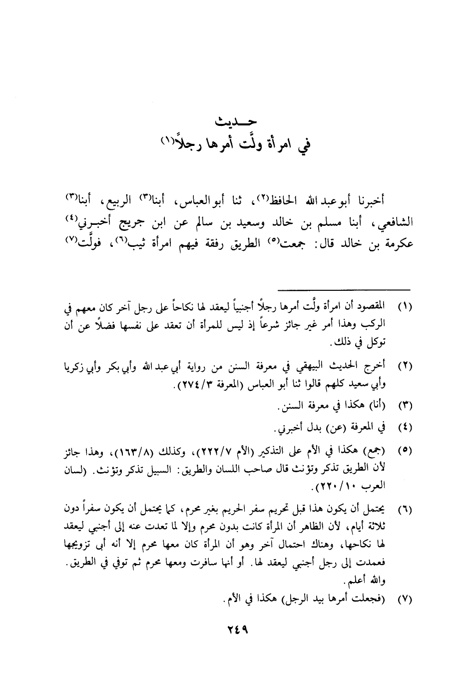 أَخْبَرَنَا أَبُو عَبْدِ اللَّهِ الْحَافِظُ ثنا أَبُو الْعَبَّاسِ أبنا الرَّبِيعُ أبنا الشَّافِعِيُّ أبنا مُسْلِمُ بْنُ خَالِدٍ، وَسَعِيدُ بْنُ سَالِمٍ عَنِ ابْنِ جُرَيْجٍ أَخْبَرَنِي عِكْرِمَةُ بْنُ خَالِدٍ قَالَ: §جَمَعَتِ الطَّرِيقُ رُفْقَةً فِيهِمُ امْرَأَةٌ ثَيِّبٌ، فَوَلَّتْ -[250]- رَجُلًا مِنْهُمْ أَمْرَهَا، فَزَوَّجَهَا رَجُلًا، فَجَلَدَ عُمَرُ بْنُ الْخَطَّابِ رَضِيَ اللَّهُ عَنْهُ النَّاكِحَ وَالْمَنْكُوحَ، وَرَدَّ نِكَاحَهَا هَكَذَا رَوَاهُ الرَّبِيعُ، عَنِ الشَّافِعِيِّ، وَرَوَاهُ الْحَسَنُ بْنُ مُحَمَّدٍ الزَّعْفَرَانِيُّ، عَنِ الشَّافِعِيِّ، وَقَالَ عَنِ ابْنِ جُرَيْجٍ عَنْ عَبْدِ الْحَمِيدِ بْنِ جُبَيْرٍ، عَنْ عِكْرِمَةَ بْنِ خَالِدٍ، وَهُوَ الصَّحِيحُ، فَقَدْ رَوَاهُ رَوْحُ بْنُ عُبَادَةَ، عَنِ ابْنِ جُرَيْجٍ، قَالَ: أَخْبَرَنِي عَبْدُ الْحَمِيدِ بْنُ جُبَيْرِ بْنِ شَيْبَةَ، عَنْ عِكْرِمَةَ بْنِ خَالِدٍ -[251]-. أبناه أَبُو بَكْرِ بْنُ الْحَارِثِ الْأَصْبَهَانِيُّ، أبنا عَلِيُّ بْنُ عُمَرَ ثنا أَبُو بَكْرٍ النَّيْسَابُورِيُّ ثنا مُحَمَّدُ بْنُ إِسْحَاقَ ثنا رَوْحُ بْنُ عُبَادَةَ عَنِ ابْنِ جُرَيْجٍ، فَذَكَرَهُ غَيْرَ أَنَّهُ قَالَ: رَكِبَا مَكَانَ رُفْقَةٍ، وَزَادَ فَبَلَغَ ذَلِكَ عُمَرَ بْنَ الْخَطَّابِ رَضِيَ اللَّهُ عَنْهُ