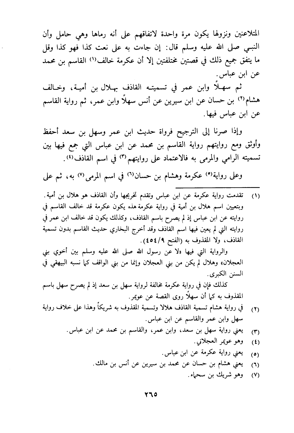 الْمُتَلَاعِنَيْنِ، وَنُزُولُهُمَا يَكُونُ مَرَّةً وَاحِدَةً لِاتِّفَاقِهِمْ عَلَى أَنَّهُ رَمَاهَا وَهِيَ حَامِلٌ، وَأَنَّ النَّبِيَّ صَلَّى اللهُ عَلَيْهِ وَسَلَّمَ قَالَ: إِنْ جَاءَتْ بِهِ عَلَى نَعْتِ كَذَا فَهُوَ كَذَا، وَقَلَّ مَا يَتَّفِقُ جَمِيعُ ذَلِكَ فِي قِصَّتَيْنِ مُخْتَلِفَتَيْنِ إِلَّا أَنَّ عِكْرِمَةَ خَالَفَ الْقَاسِمَ بْنَ مُحَمَّدٍ عَنِ ابْنِ عَبَّاسٍ. ثُمَّ سَهْلًا وَابْنَ عُمَرَ فِي تَسْمِيَتِهِ الْقَاذِفَ بِهَلَالِ بْنِ أُمَيَّةَ عَدَا هِشَامَ بْنَ حَسَّانَ، عَنِ ابْنِ حَسَّانَ، عَنِ ابْنِ سِيرِينَ، عَنْ أَنَسٍ سَهْلًا وَابْنَ عُمَرَ، ثُمَّ رِوَايَةُ الْقَاسِمِ عَنِ ابْنِ عَبَّاسِ فِيهَا. وَإِذَا صِرْنَا إِلَى التَّرْجِيحِ فَرُوَاةُ حَدِيثِ ابْنِ عُمَرَ وَسَهْلِ بْنِ سَعْدٍ أَحْفَظُ وَأَوْثَقُ، وَمَعَ رِوَايَتِهِمْ رِوَايَةَ الْقَاسِمِ بْنِ مُحَمَّدٍ عَنِ ابْنِ عَبَّاسٍ الَّتِي جَمَعَ فِيهَا بَيْنَ تَسْمِيَتِهِ الرَّامِي وَالْمَرْمِيَّ بِهِ، فَالِاعْتِمَادُ عَلَى رِوَايَتِهِمْ فِي اسْمِ الْقَاذِفِ، وَعَلَى رِوَايَةِ عِكْرِمَةَ وَهِشَامِ بْنِ حَسَّانَ فِي اسْمِ الْمَرْمِيِّ بِهِ، ثُمَّ عَلَى