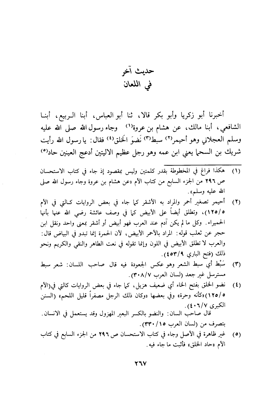أَخْبَرَنَا أَبُو زَكَرِيَّا، وَأَبُو بَكْرٍ، قَالَا: ثنا أَبُو الْعَبَّاسِ أبنا الرَّبِيعُ أبنا الشَّافِعِيُّ أبنا مَالِكٌ عَنْ هِشَامِ بْنِ عُرْوَةَ: وَجَاءَ رَسُولَ اللَّهِ صَلَّى اللهُ عَلَيْهِ وَسَلَّمَ الْعَجْلَانِيُّ وَهُوَ أُحَيْمِرُ سَبْطٌ نَضْوَ الْخَلْقِ، فَقَالَ: يَا رَسُولَ اللَّهِ رَأَيْتُ شَرِيكَ بْنَ السَّحْمَا يَعْنِي ابْنَ عَمِّهِ، وَهُوَ رَجُلٌ عَظِيمُ الْأَلْيَتَيْنِ، أَدْعَجُ الْعَيْنَيْنِ، حَادُّ -[268]- الْخَلْقِ يُصِيبُ فُلَانَةَ يَعْنِي امْرَأَتَهُ وَهِيَ حُبْلَى وَمَا قَرَبْتُهَا مُنْذُ كَذَا وَكَذَا، فَدَعَا رَسُولُ اللَّهِ صَلَّى اللهُ عَلَيْهِ وَسَلَّمَ شَرِيكًا، فَجَحَدَ وَدَعَا الْمَرْأَةَ فَجَحَدَتْ، فَلَاعَنَ بَيْنَهَا وَبَيْنَ زَوْجِهَا وَهِيَ حُبْلَى، ثُمَّ قَالَ: §أَبْصِرُوهَا فَإِنْ جَاءَتْ بِهِ أَدْعَجَ عَظِيمَ الْأَلْيَتَيْنِ فَلَا أُرَاهُ إِلَّا قَدْ صَدَقَ عَلَيْهَا، وَإِنْ جَاءَتْ بِهِ أُحَيْمِرَ كَأَنَّهُ وَحَرَةٌ فَلَا أُرَاهُ إِلَّا قَدْ كَذَبَ، فَجَاءَتْ بِهِ أَدْعَجَ عَظِيمَ الْأَلْيَتَيْنِ -[269]- فَقَالَ رَسُولُ اللَّهِ صَلَّى اللهُ عَلَيْهِ وَسَلَّمَ فِيمَا بَلَغَنَا «إِنَّ أَمْرَهُ لَبَيِّنٌ» لَوْلَا مَا قَضَى مِنْ أَلَّا يَحْكُمَ عَلَى أَحَدٍ إِلَّا بِإِقْرَارٍ وَاعْتِرَافٍ عَلَى نَفْسِهِ، لَا يَحِلُّ بِدَلَالَةِ غَيْرِ وَاحِدٍ مِنْهُمَا، وَإِنْ كَانَتْ بَيِّنَةً، وَقَالَ: «لَوْلَا مَا قَضَى اللَّهُ لَكَانَ لِي فِيهَا قَضَاءٌ غَيْرُهُ» وَلَمْ يَعْرِضْ لِشَرِيكٍ وَلَا لِلْمَرْأَةِ، وَأَنْفَذَ الْحُكْمَ وَهُوَ يَعْلَمُ أَنَّ أَحَدَهُمَا كَاذِبٌ، ثُمَّ عَلِمَ بَعْدُ أَنَّ الزَّوْجَ هُوَ الصَّادِقُ. قَالَ الشَّيْخُ: قَوْلُهُ عَلَيْهِ السَّلَامُ «إِلَا بِإِقْرَارٍ وَاعْتِرَافٍ عَلَى نَفْسِهِ» -[270]- كَذَا وَقَعَ فِي الْكِتَابِ، وَصَوَابُهُ إِلَّا بِشُهُودٍ أَوِ اعْتِرَافٍ، وَقَوْلُهُ: وَإِنْ كَانَتْ بَيِّنَةٌ يُرِيدُ بِهِ دَلَالَةَ بَيِّنَةٍ ظَاهِرَةٍ، وَأَمَّا رِوَايَتُهُ عَنْ مَالِكٍ، عَنْ هِشَامِ بْنِ عُرْوَةَ، وَرَبْطُ هَذَا الْمَتْنِ عَلَيْهَا، فَإِنَّهَا زَلَّةٌ وَقَعَتْ مِنْ جِهَةِ نَقْلِ هَذِهِ الْأَحَادِيثِ مِنَ الْمَبْسُوطِ إِلَى الْمُسْنَدِ وَلَمْ يَرْوِ مَالِكُ بْنُ أَنَسٍ وَلَا الشَّافِعِيُّ هَذَا الْمَتْنَ بِهَذَا الْإِسْنَادِ، وَهُمَا مَعَ هِشَامِ بْنِ عُرْوَةَ يَبْرَءُونَ إِلَى اللَّهِ تَعَالَى مِنْ هَذَا الْخَطَأِ الْفَاحِشِ، وَإِنَّمَا وَقَعَتْ هَذِهِ الزَّلَّةُ لِهَذَا النَّاقِلِ فِيمَا أَرَى مِنْ أَنَّ الشَّافِعِيَّ رَحِمَهُ اللَّهُ ذَكَرَ فِي كِتَابِ إِبْطَالِ الِاسْتِحْسَانِ فَصْلًا فِي أَنَّ الْأَحْكَامَ فِي الدُّنْيَا إِنَّمَا هِيَ عَلَى مَا أَظْهَرَ الْعِبَادُ وَأَنَّ اللَّهَ عَزَّ وَجَلَّ يَدِينُ بِالسَّرَائِرِ. وَاحْتَجَّ بِأَمْرِ الْمُنَافِقِينَ وَبِحَدِيثِ أَبِي هُرَيْرَةَ «لَا أَزَالُ أُقَاتِلُ النَّاسَ حَتَّى يَقُولُوا لَا إِلَهَ إِلَّا اللَّهَ» ثُمَّ قَالَ: أبنا مَالِكُ، عَنْ هِشَامِ بْنِ عُرْوَةَ، وَإِنَّمَا أَرَادَ حَدِيثَ هِشَامِ بْنِ عُرْوَةَ، عَنْ أَبِيهِ، عَنْ زَيْنَبَ بِنْتِ أَبِي سَلَمَةَ، عَنْ أُمِّ سَلَمَةَ: أَنَّ رَسُولَ اللَّهِ صَلَّى اللهُ عَلَيْهِ وَسَلَّمَ -[271]- قَالَ: «إِنَّمَا أَنَا بَشَرٌ وَإِنَّكُمْ تَخْتَصِمُونَ إِلَيَّ» الْحَدِيثَ، وَانْقَطَعَ بَعْضُ الْإِسْنَادِ وَجَمِيعُ الْمَتْنِ إِمَّا بِتَرْكٍ وَقَعَ فِي بَعْضِ النُّسَخِ أَوْ تَرَكَ الشَّافِعِيُّ إِتْمَامَهُ لِيَرْجِعَ إِلَى الْأَصْلِ فَيُثْبِتَهُ مِنَ الْكِتَابِ عَلَى الْيَقِينِ، وَتَرَكَ الْبَيَاضَ وَاسْتَدَلَّ بَعْدَهُ بِقِصَّةِ الْعَجْلَانِيِّ، فَقَالَ: وَجَاءَ الْعَجْلَانِيُّ رَسُولَ اللَّه