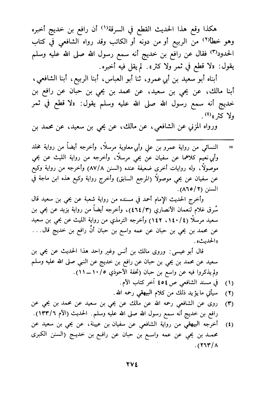أبناه أَبُو سَعِيدِ بْنُ أَبِي عَمْرٍو، ثنا أَبُو الْعَبَّاسِ أبنا الرَّبِيعُ أبنا الشَّافِعِيُّ أبنا مَالِكٌ عَنْ يَحْيَى بْنِ سَعِيدٍ عَنْ مُحَمَّدِ بْنِ يَحْيَى بْنِ حِبَّانَ عَنْ رَافِعِ بْنِ خَدِيجٍ أَنَّهُ سَمِعَ رَسُولَ اللَّهِ صَلَّى اللهُ عَلَيْهِ وَسَلَّمَ يَقُولُ: «§لَا قَطْعَ فِي ثَمَرٍ وَلَا كَثَرٍ» وَرَوَاهُ الْمُزَنِيُّ، عَنِ الشَّافِعِيِّ، عَنْ مَالِكِ، عَنْ يَحْيَى بْنِ سَعِيدٍ، عَنْ مُحَمَّدِ بْنِ -[275]- يَحْيَى بْنِ حِبَّانَ: أَنَّ عَبْدًا سَرَقَ وَدِيًّا مِنْ حَائِطِ رَجُلٍ، فَذَكَرَ الْحَدِيثَ إِلَى أَنْ قَالَ: فَانْطَلَقَ سَيِّدُ الْعَبْدِ إِلَى رَافِعِ بْنِ خَدِيجٍ فَسَأَلَهُ عَنْ ذَلِكَ فَأَخْبَرَهُ أَنَّهُ سَمِعَ رَسُولَ اللَّهِ صَلَّى اللهُ عَلَيْهِ وَسَلَّمَ يَقُولُ: «لَا قَطْعَ فِي ثَمَرٍ وَلَا كَثَرٍ» أَخْبَرَنَا أَبُو إِسْحَاقَ الْأَرْمَوِيُّ، أبنا شَافِعُ بْنُ مُحَمَّدٍ أبنا أَبُو جَعْفَرِ بْنُ سَلَامَةَ ثنا الْمُزَنِيُّ ثنا الشَّافِعِيُّ، فَذَكَرَهُ وَكَذَلِكَ رَوَاهُ الشَّافِعِيُّ فِي الْقَدِيمِ، وَقَالَ: هَذَا مُرْسَلٌ يَعْنِي بَيْنَ مُحَمَّدِ بْنِ يَحْيَى بْنِ حِبَّانَ وَرَافِعٍ فَكَيْفَ يَحْكُمُ بِإِرْسَالِهِ ثُمَّ يَرْوِيهِ مَوْصُولًا دَلَّ أَنَّ هَذَا الْخَطَأَ وَقَعَ مِنْ غَيْرِهِ، وَقَدْ يَحْتَمِلُ أَنَّهُ رَوَاهُ حِينَ رَوَاهُ مُخْتَصَرًا، فَقَالَ: إِنَّ رَافِعَ بْنَ خَدِيجٍ، أَخْبَرَهُ أَنَّهُ سَمِعَ رَسُولَ اللَّهِ صَلَّى اللهُ عَلَيْهِ وَسَلَّمَ بِغَيْرِهَا فَزَادَ فِيهِ الْكَاتِبُ هَا، فَأَمَّا الشَّافِعِيُّ فَإِنَّمَا رَوَاهُ عَلَى الْإِرْسَالِ، وَكَذَلِكَ أَصْحَابُ الْمُوَطَّأِ، وَإِنَّمَا رَوَاهُ مَوْصُولًا مِنْ حَدِيثِ ابْنِ عُيَيْنَةَ، عَنْ يَحْيَى بْنِ سَعِيدِ عَنْ مُحَمَّدِ بْنِ يَحْيَى بْنِ حِبَّانَ، عَنْ عَمِّهِ وَاسِعِ بْنِ حِبَّانَ عَنْ رَافِعٍ